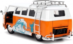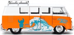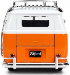Model w skali 1:24 oferuje otwierane elementy (drzwi), detaliczne wnętrze, chromowane dodatki oraz płynny ruch kół, co ułatwia przemieszczanie po powierzchni. W zestawie znajduje się również figurka STITCH o wysokości ok. 4 cm, idealnie współgrająca z tematycznym nadrukiem „Catching Waves”.