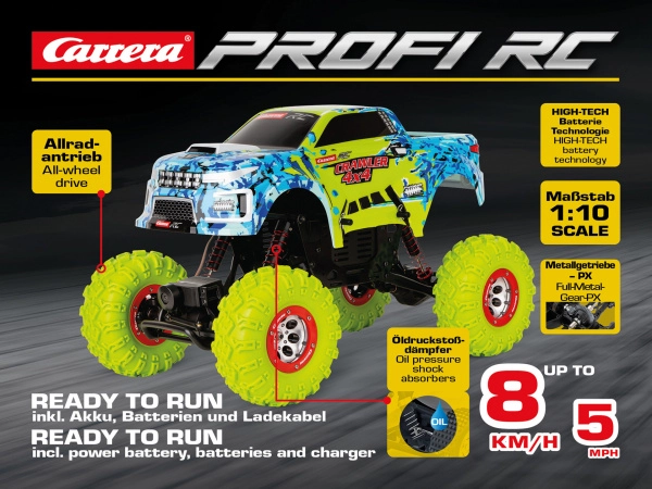 Terenowy model RC CARRERA PROFI Crawler jest zbudowany z myślą o wymagających warunkach. Solidne podwozie, duży prześwit i przekazanie mocy 4x4 radzą sobie z kamieniami, żwirem i błotem. Olejowe amortyzatory gwarantują świetne kopiowanie terenu i stabilność, a precyzyjne cyfrowe sterowanie proporcjonalne daje pełną kontrolę nad każdym ruchem.