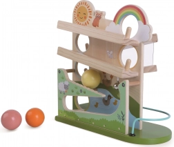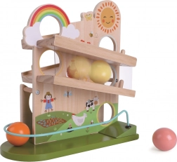 Ten kreatywny tor kulkowy ze świeżym, wiejskim designem zamienia każdą zabawę w barwną przygodę. Dzieci obserwują, jak kulki rozpędzają się po różnie nachylonych trasach, znikają w otworach i znów się pojawiają – wszystko w towarzystwie radosnych ilustracji słońca, tęczy i zwierzątek. Stabilna podstawa i gładko wykończone drewniane elementy gwarantują bezpieczne użytkowanie nawet dla najmłodszych.