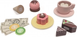 Zestaw wykonano z wytrzymałego drewna w delikatnych pastelowych kolorach i wyposażono w bogate akcesoria: filiżanki ze spodkami, łyżeczki, sztućce, torciki, lody i inne dodatki, które wspierają zabawy w role, rozwój małej motoryki, umiejętności społecznych oraz wypowiedzi językowej.