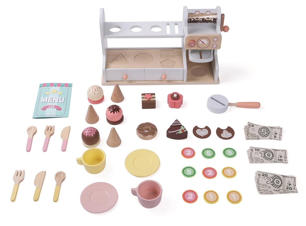 - Drewniany zestaw do odgrywania ról – cukiernia i kawiarnia 2 w 1