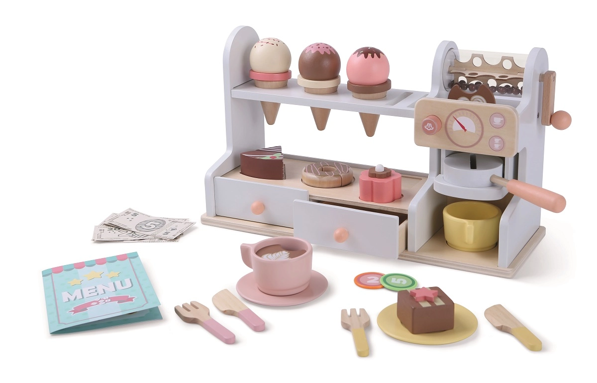 Ta stylowa drewniana cukiernia i kawiarnia 2 w 1 zmieni pokój dziecięcy w małe bistro. Kompaktowy blat z ekspresem, gablotką na desery oraz półką z otworami na gałki lodów zachęca do niekończącej się zabawy. W zestawie znajduje się także szuflada płatnicza z fałszywymi pieniędzmi, dzięki czemu dzieci mogą ćwiczyć obsługę i płacenie.