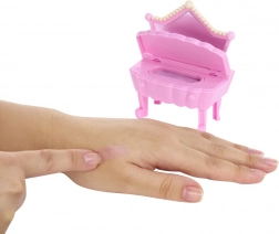 Różowa toaletka z wieczkiem i zdobieniami oferuje przegródkę na drobiazgi. Dzieci mogą uporządkować lakiery, naklejki i błyszczyki, tworząc własny kącik kosmetyczny.