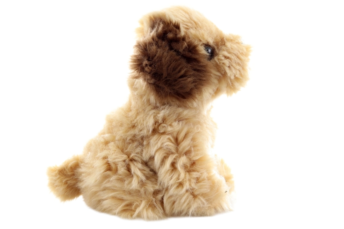 Ciemniejsze uszka, czarny nosek i siedząca poza nadają zabawce wierny wygląd prawdziwego szczenięcia.