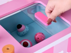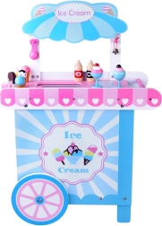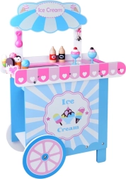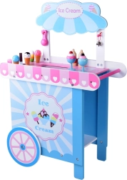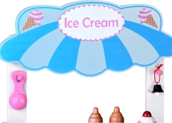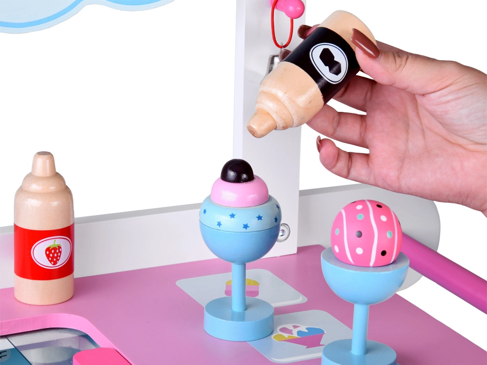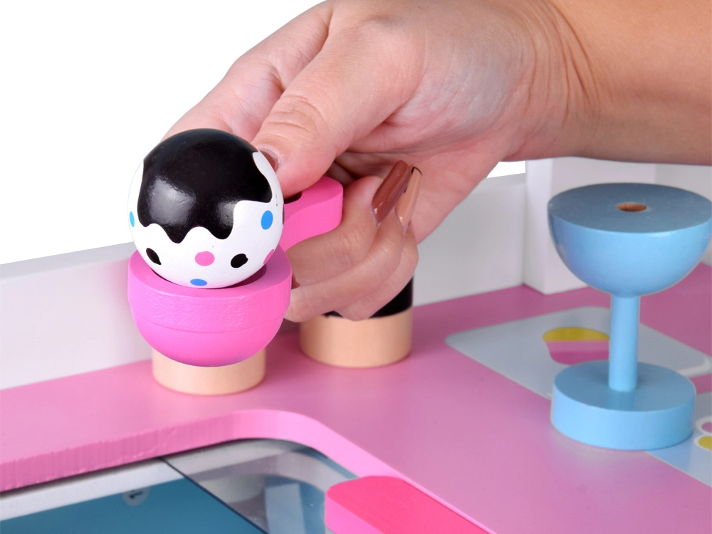 Ten stylowy dziecięcy wózek z lodami w delikatnych różowych i niebieskich odcieniach jest idealny do zabawy w sklep i lodziarnię. Górny blat służy jako lada do eksponowania gałek, rożków i lodów na patyku, a pod nim znajdziesz dużą półkę oraz przesuwaną „lodówkę” do przechowywania smakołyków i akcesoriów. Praktyczne dwa haczyki i srebrny dzwoneczek dopełniają autentyczne wrażenia z serwowania.