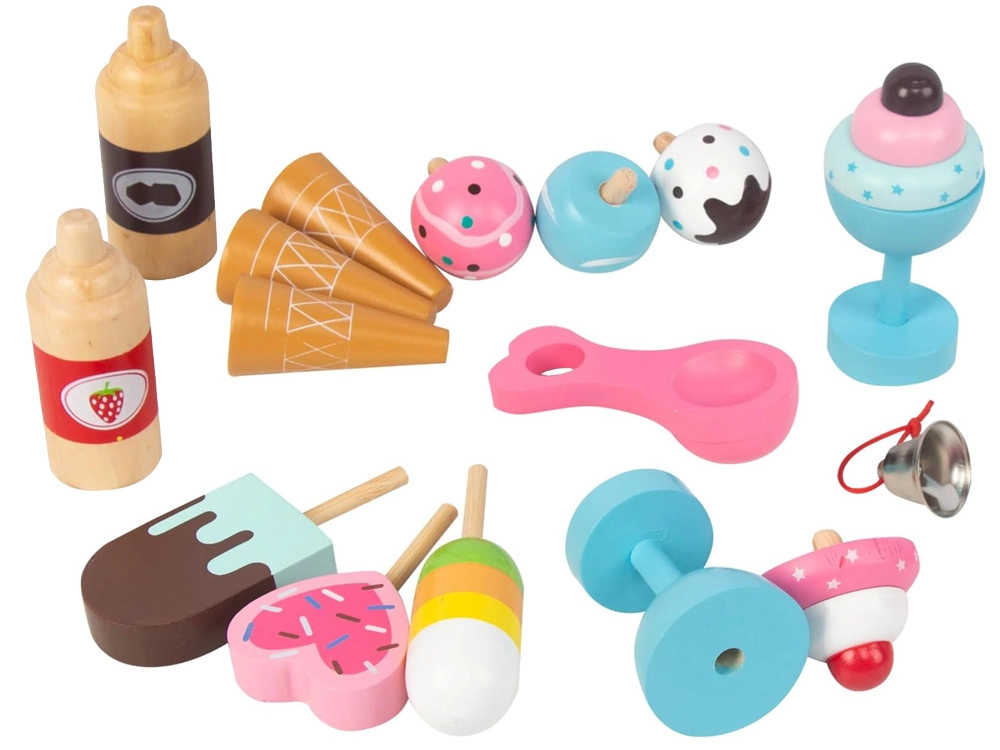 Syropy, pucharki, rożki, lody na patyku oraz łyżka do nakładania – wszystko do autentycznej lodziarni, uzupełnione dzwoneczkiem i haczykami.
