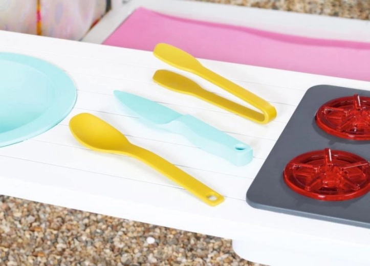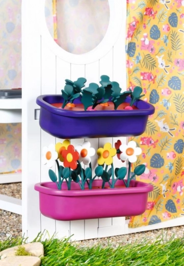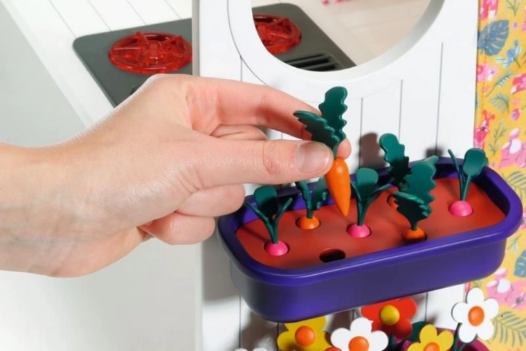 Domek wyposażono w skrzynki i warzywny ogródek do zbioru składników na wyimaginowane kolacje. Dzieci mogą przygotowywać jedzenie na kuchence i nakrywać do stołu dla swoich lalek, serwując sałatki i precelki.