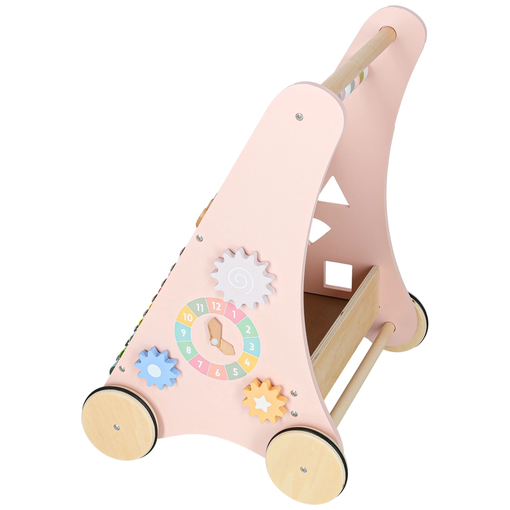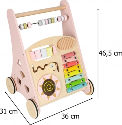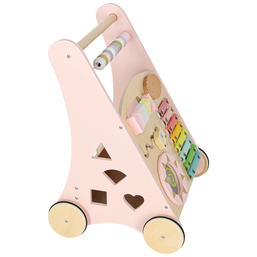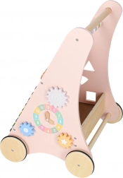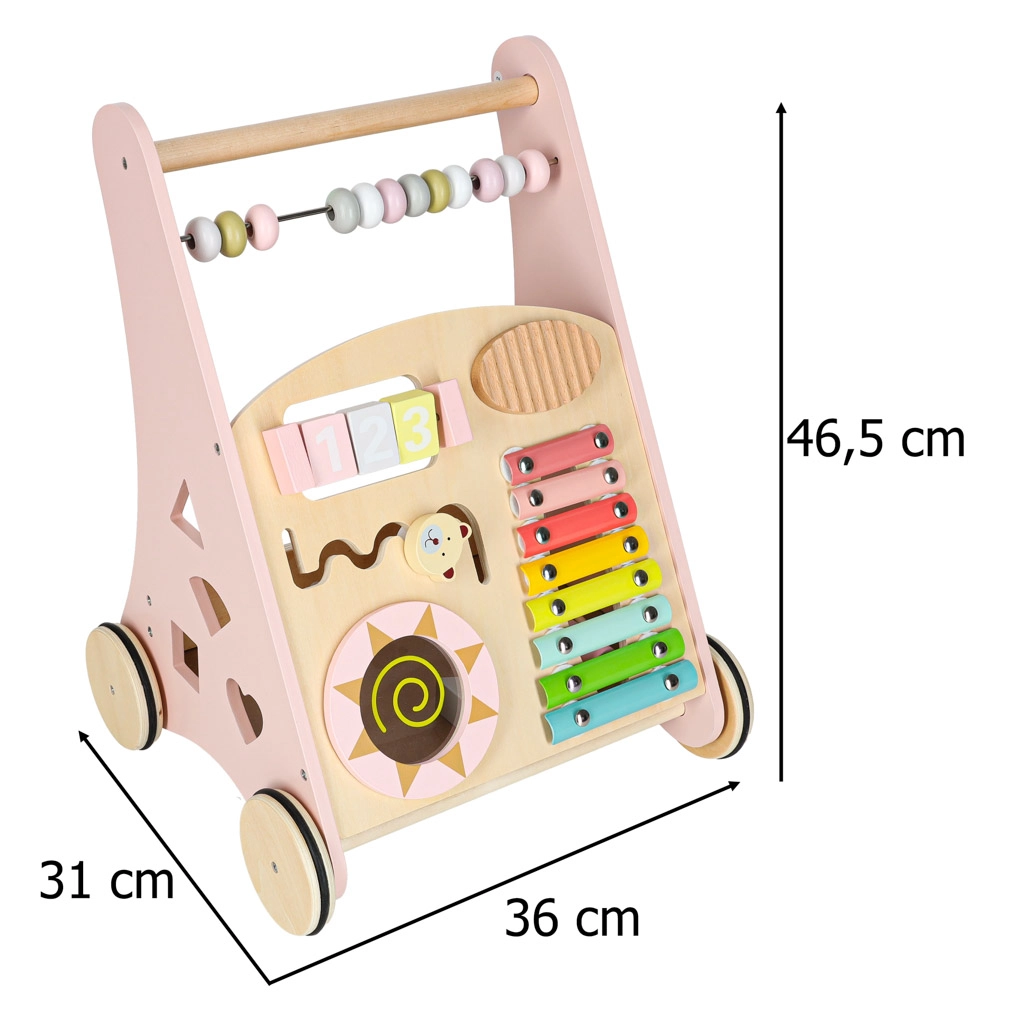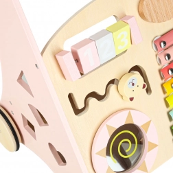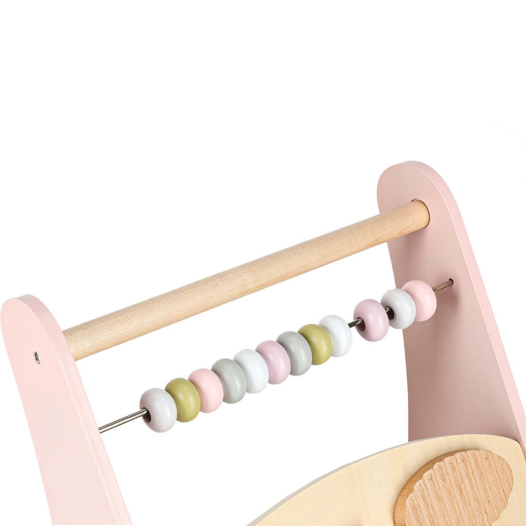 Ten stylowy drewniany pchacz w pastelowym różu wspiera równowagę, koordynację i pewność podczas chodzenia. Przedni panel wyposażono w wiele aktywności: liczydło do pierwszych obliczeń, ksylofon do odkrywania dźwięków, zębate kółka, obrotowy dysk, sortowanie kształtów oraz elementy przesuwne, które rozwijają małą motorykę i koncentrację.