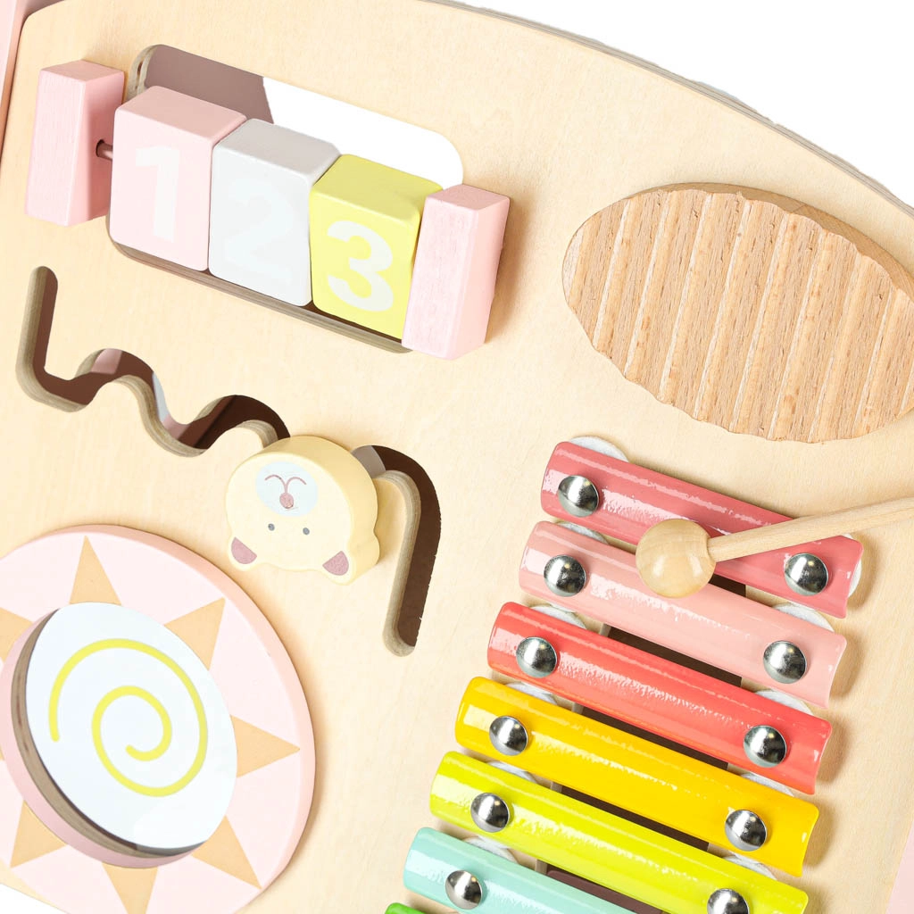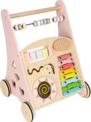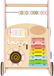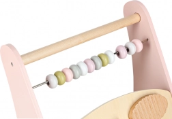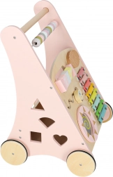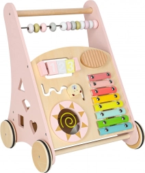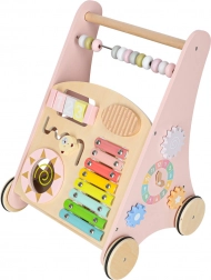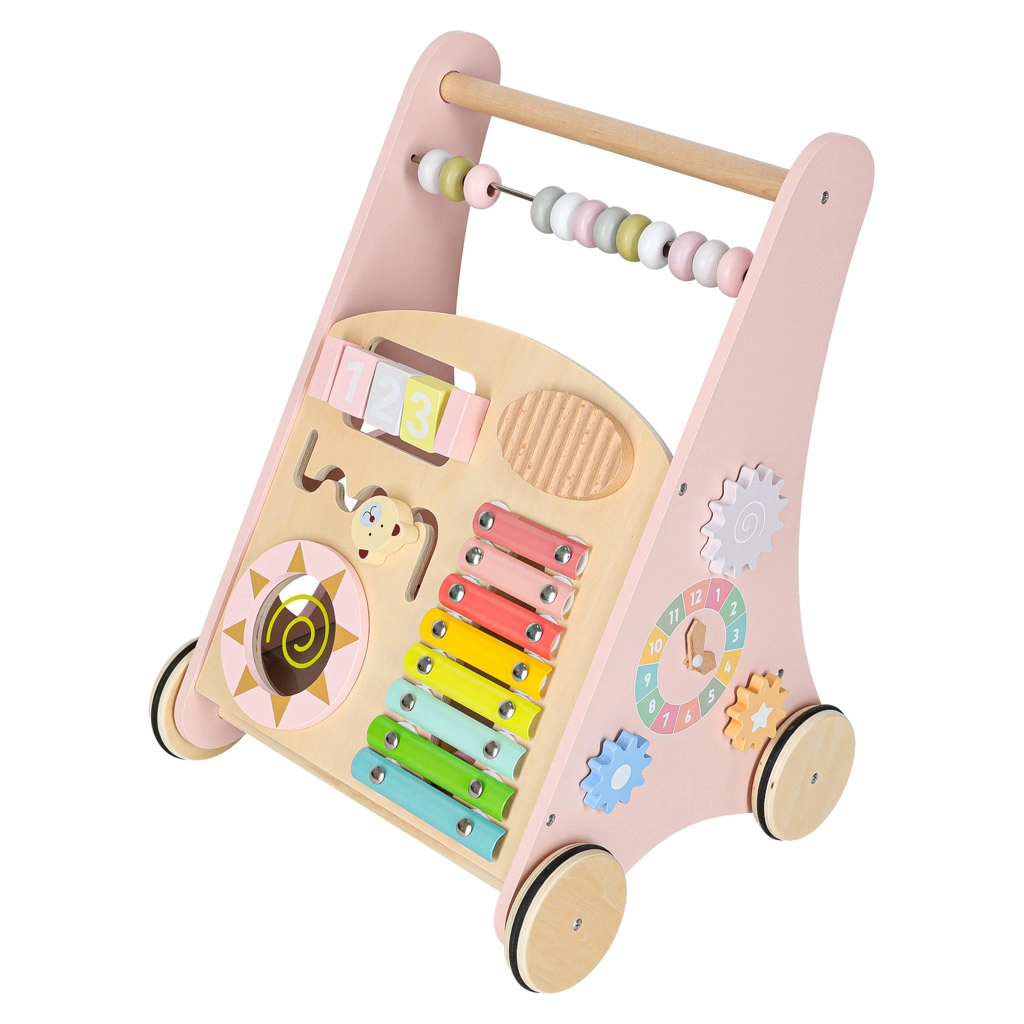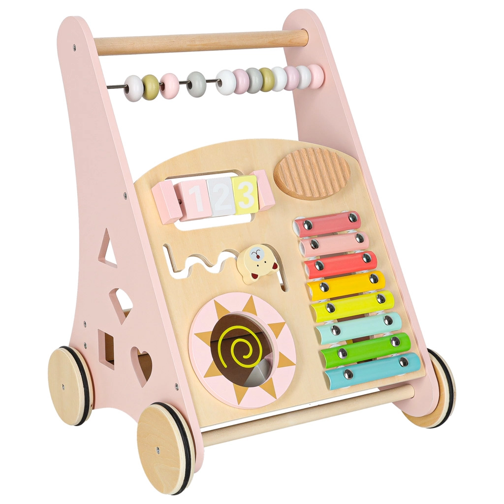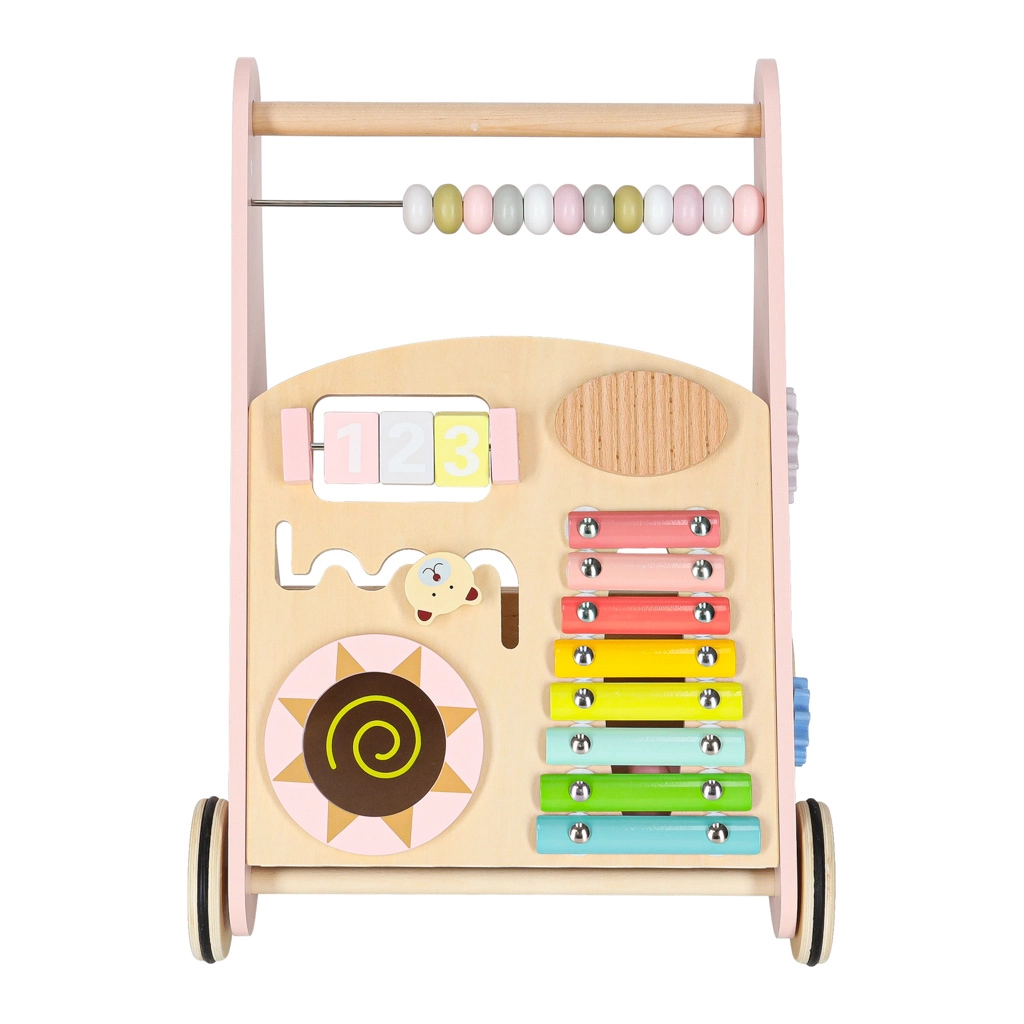 Ten stylowy drewniany pchacz w pastelowym różu wspiera równowagę, koordynację i pewność podczas chodzenia. Przedni panel wyposażono w wiele aktywności: liczydło do pierwszych obliczeń, ksylofon do odkrywania dźwięków, zębate kółka, obrotowy dysk, sortowanie kształtów oraz elementy przesuwne, które rozwijają małą motorykę i koncentrację.