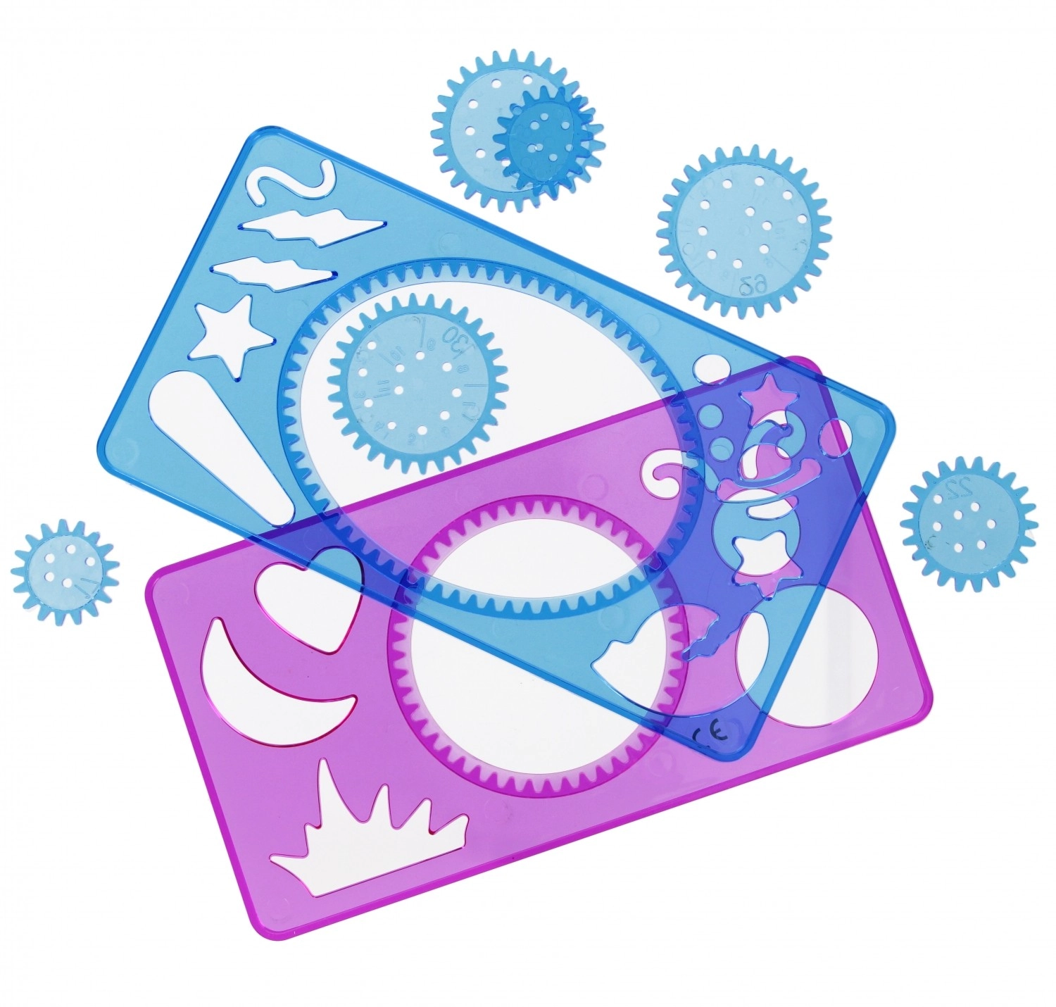 Dwie solidne, przezroczyste płyty z zębatymi pierścieniami i kształtami umożliwiają precyzyjne prowadzenie kółeczek i czyste linie nawet przy złożonych wzorach.