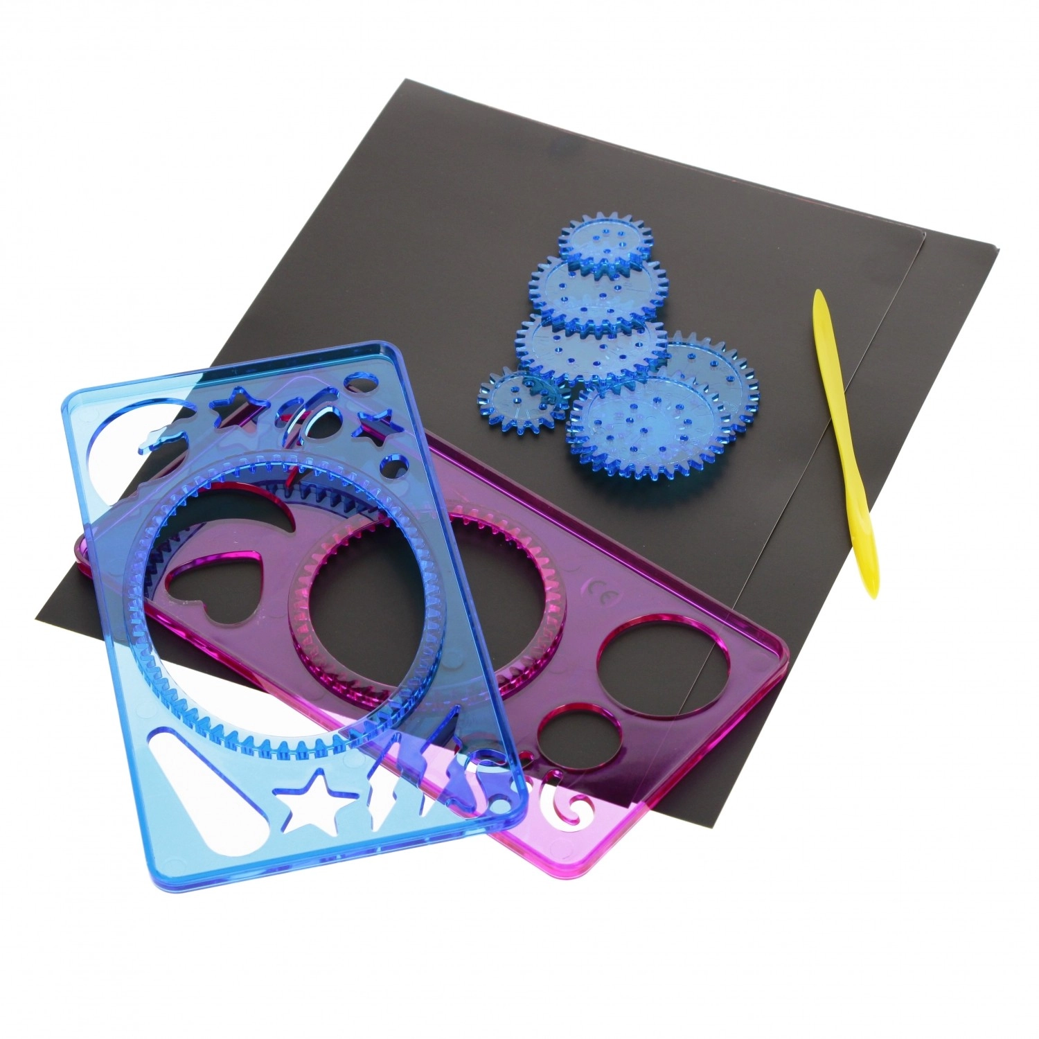 Zestaw zawiera szablony, zębate kółeczka, rysik/długopis oraz papier – zacznij tworzyć od razu po rozpakowaniu, bez dodatkowych zakupów.