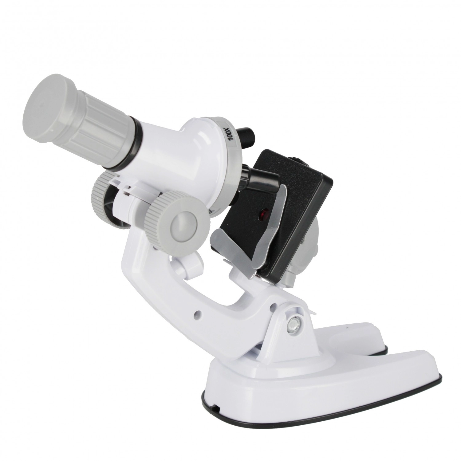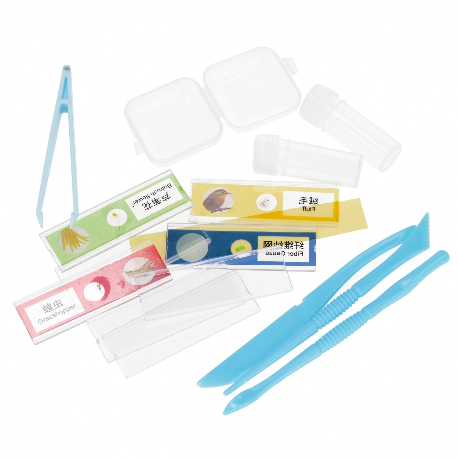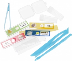 • Kompletny zestaw: mikroskop, 1× pęseta, 3× nożyki/szkiełka preparatowe, 2× probówki, 1× pudełko, 4× szablony badawcze z rysunkami, 4× puste szablony, instrukcja
