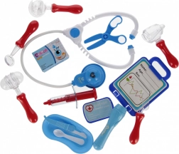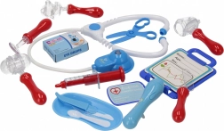 Zestaw zawiera wszystko, co potrzebne do podstawowego badania: stetoskop, strzykawkę, kartonowe „leki”, latarkę, akcesoria laryngologiczne, pojemnik na narzędzia, kartę pacjenta oraz nożyczki. Dzięki wymiarom 40 × 29 cm zestaw jest poręczny, a jednocześnie bogaty w elementy.