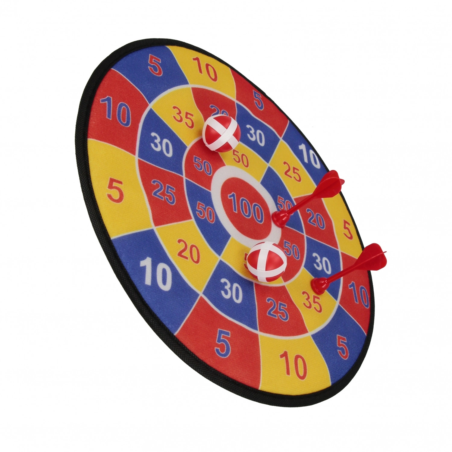 Kontrastowe czerwone, żółte i niebieskie sektory z numerami motywują dzieci do trafiania i uczą liczenia punktów w zabawny sposób.