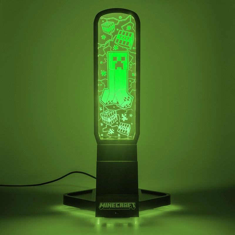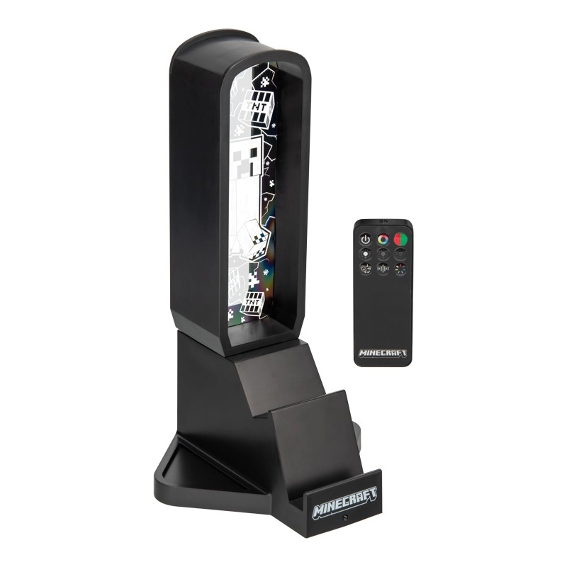 Stylowy uchwyt na słuchawki inspirowany światem Minecraft wyróżnia się wysokością 30 cm, wielokolorowymi trybami podświetlenia, praktycznym uchwytem na telefon oraz parą portów USB‑C do ładowania akcesoriów. Sterowanie jest wygodne dzięki pilotowi zdalnego sterowania oraz zasilaniu przez kabel USB, który znajduje się w zestawie.