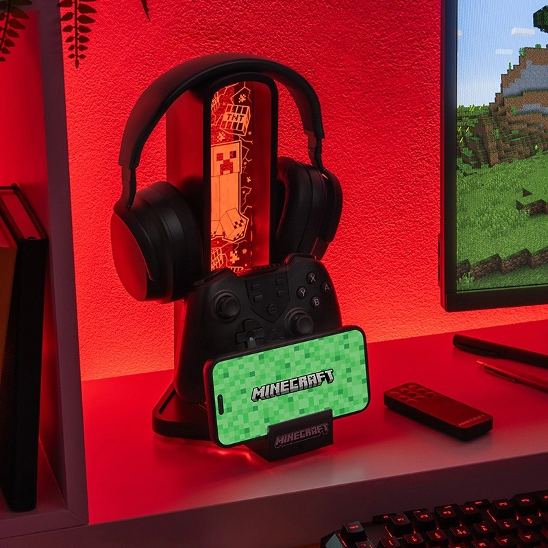 Dodaj atmosfery swojemu gamingowemu kącikowi dzięki uchwytowi na słuchawki w stylu Minecraft. Wysokość 30 cm zapewnia stabilne przechowywanie większości słuchawek, a zintegrowana podstawka na telefon utrzyma smartfon zawsze pod ręką. Wiele trybów podświetlenia tworzy unikalne efekty świetlne do grania i pracy.