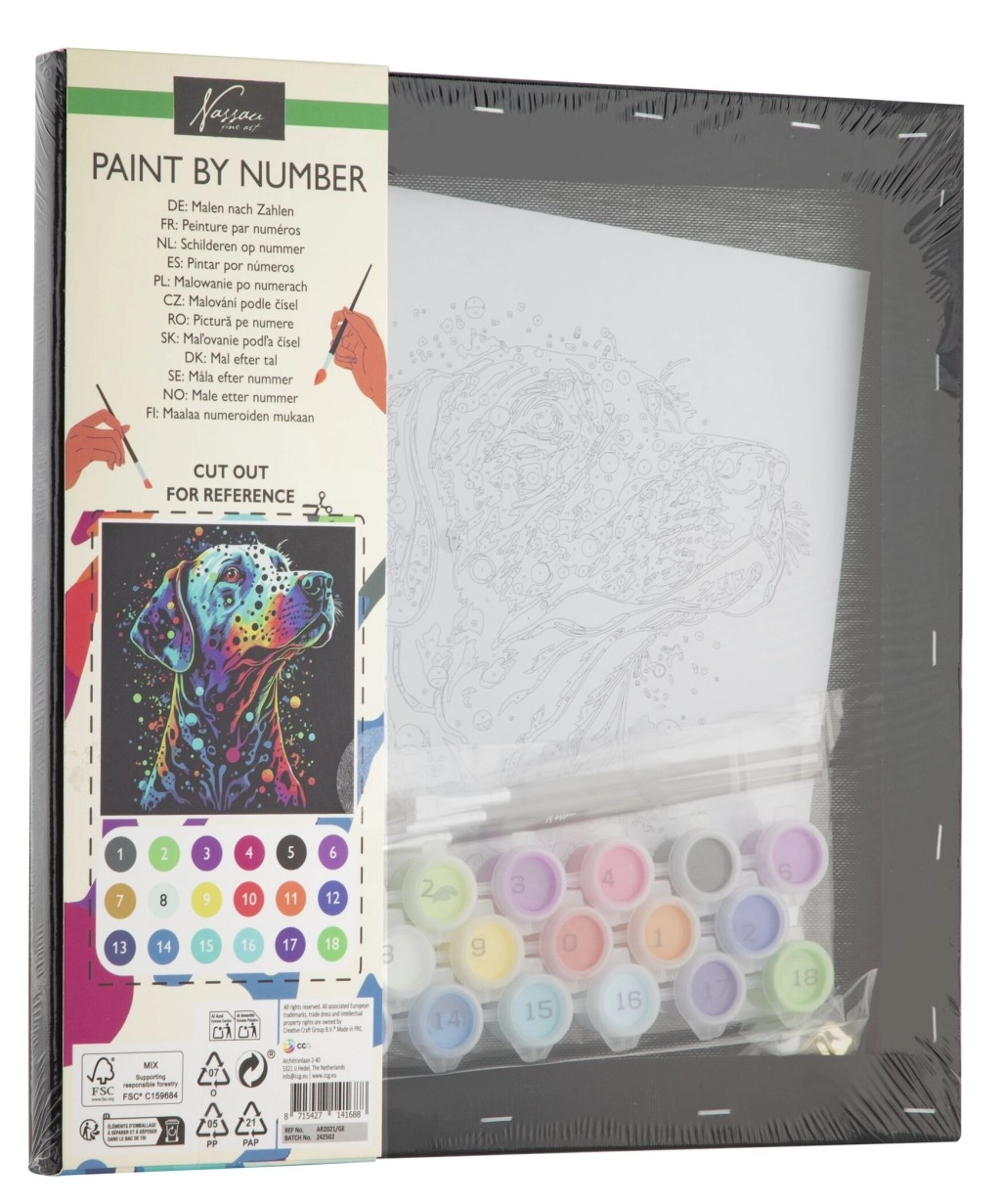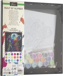Zawartość opakowania: 1× płótno z nadrukowanym motywem, zestaw farb akrylowych, 1× pędzelek, drukowana instrukcja.