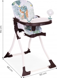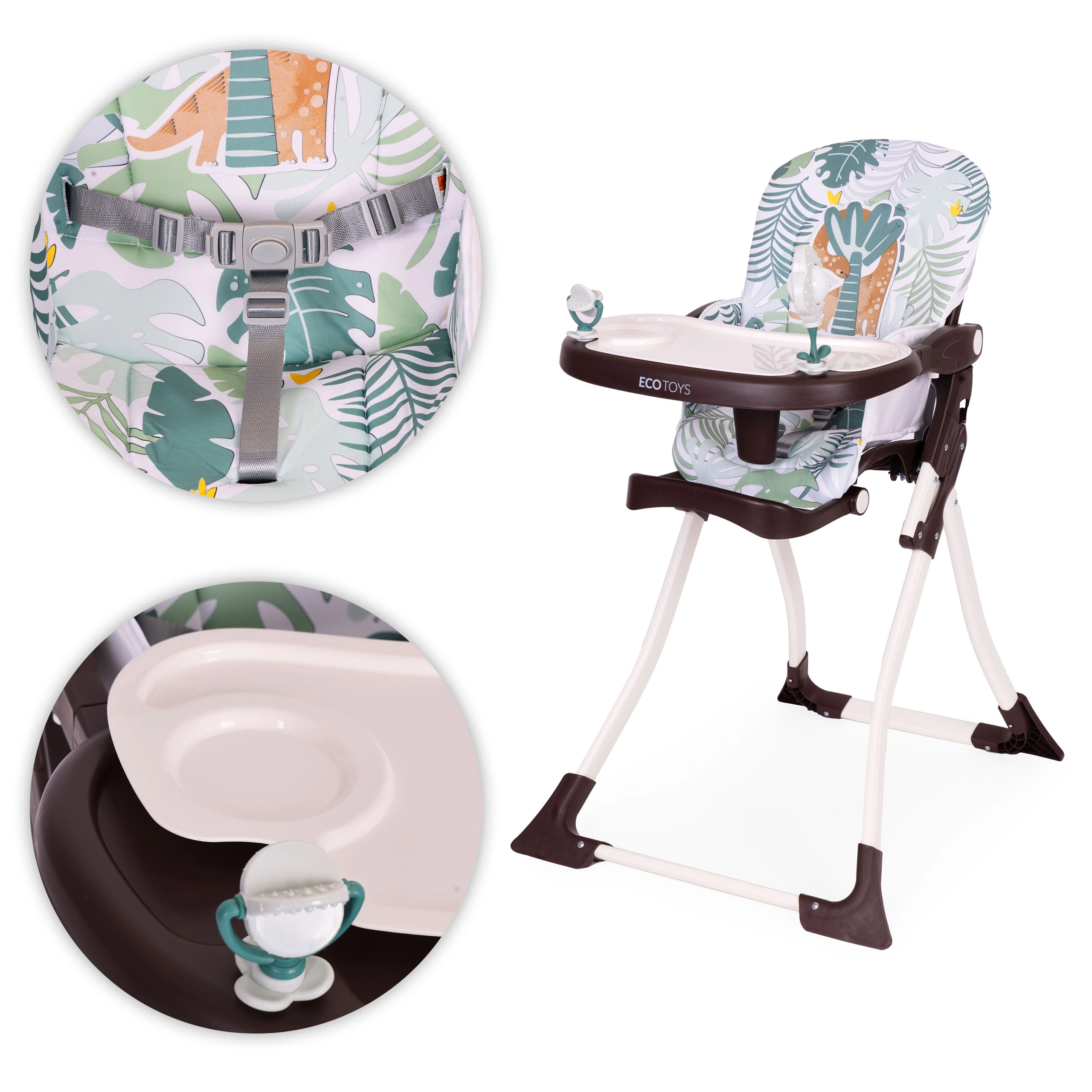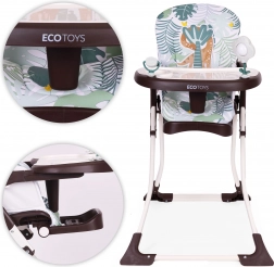 Krzesło do karmienia ECOTOYS ułatwia wspólne posiłki i zapewnia dziecku wygodę oraz bezpieczeństwo. Szeroka tacka oferuje dużo miejsca na talerzyk, kubek i zabawę – w zestawie są obrotowa zabawka i grzechotka, które bawią i rozwijają zmysły. Składana konstrukcja oszczędza miejsce w małych wnętrzach i ułatwia transport.