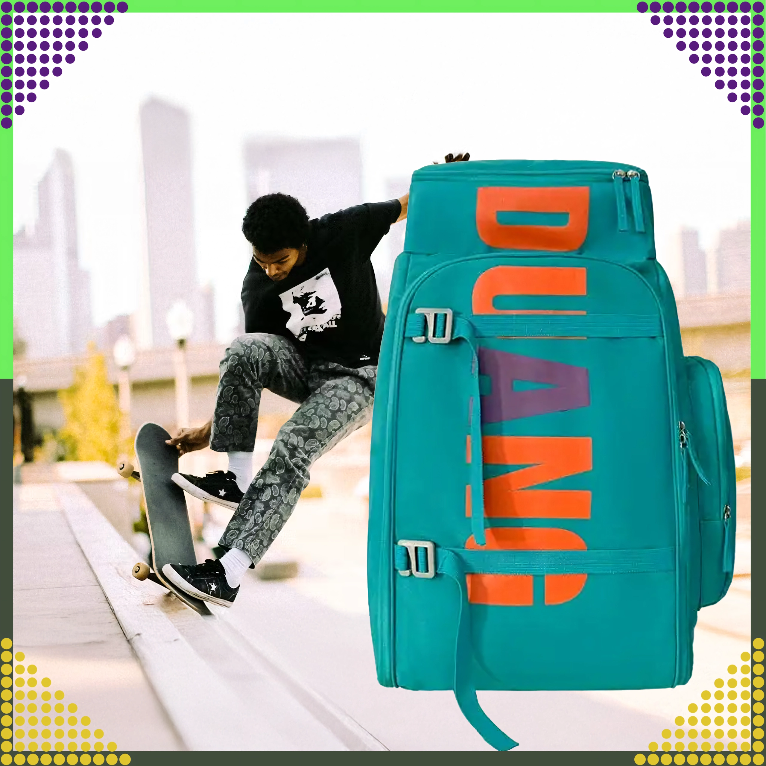 Pojemny i wytrzymały plecak dla młodych skejterek i skejterów o pojemności 55 l oferuje solidną konstrukcję, praktyczne kieszenie i wygodę na co dzień. Świetnie sprawdzi się do szkoły, na wycieczki oraz do jazdy na deskorolce.