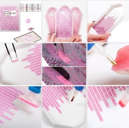 Żłobkowana tacka ustawia diamenciki w rządku, dzięki czemu pióro łatwo je nabiera i umieszcza we właściwym miejscu na płótnie.