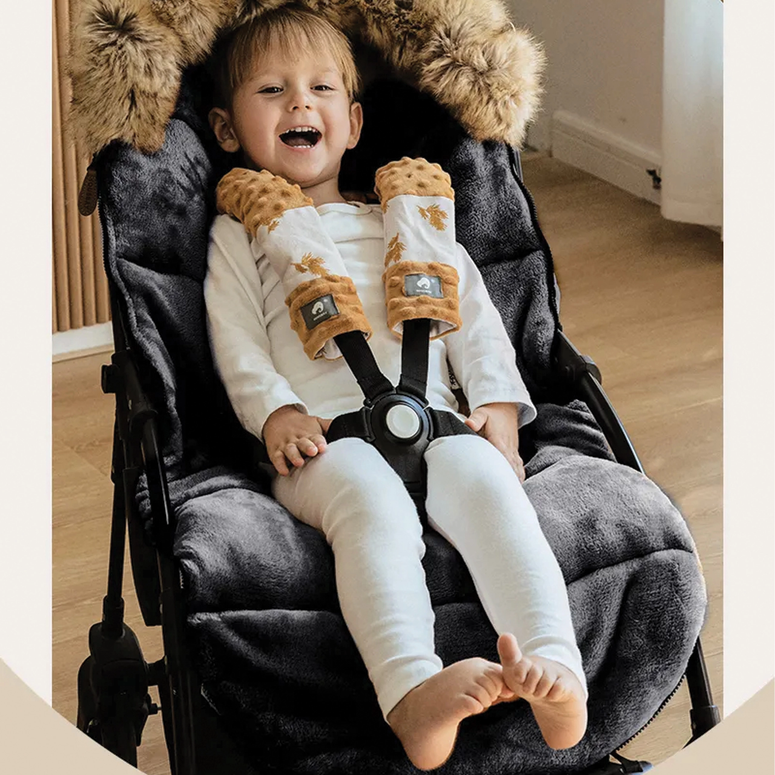 Pionowe otwory na pasy i dwukierunkowe zamki ułatwiają mocowanie i wentylację. Kompatybilny z większością wózków i gondoli, odpowiedni także na sanki.