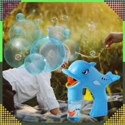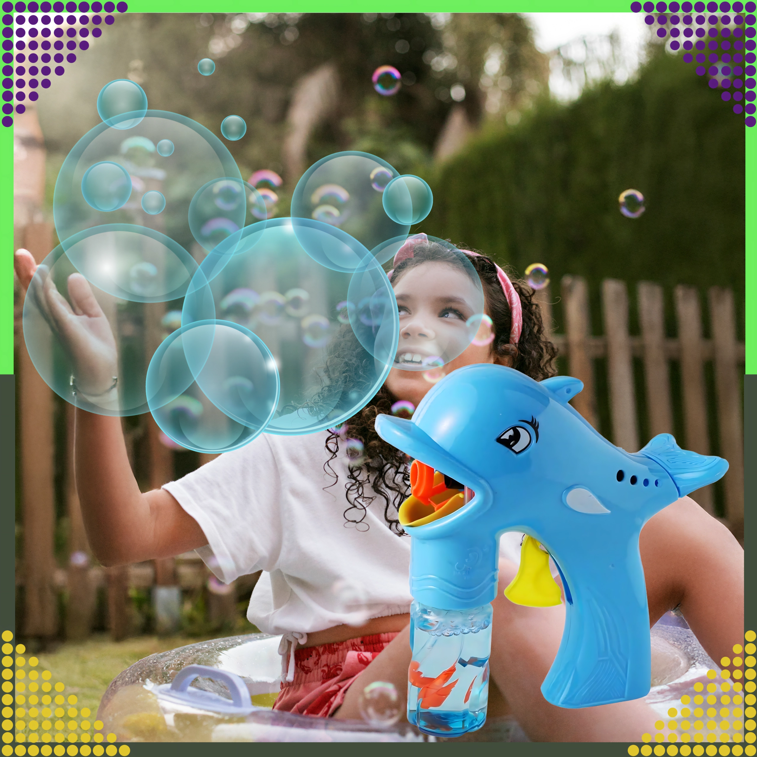 Rozjaśnij każde dziecięce popołudnie bańkową zabawą! Pistolet do baniek w kształcie delfina po przykręceniu buteleczki z roztworem wyrzuca dziesiątki aż po setki baniek w ciągu kilku sekund. Wystarczy wkręcić wkład, nacisnąć spust i cieszyć się tęczowym show na świeżym powietrzu i w pomieszczeniach.