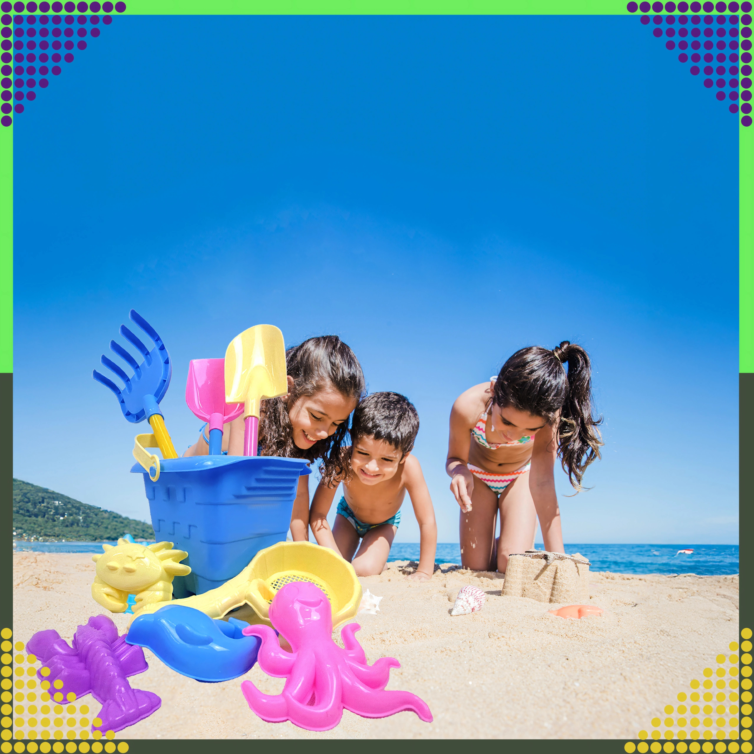 Wesoły zestaw plażowych zabawek z wiaderkiem, foremkami i łopatką zapewnia dzieciom kreatywną zabawę na plaży, w ogrodzie i w piaskownicy. Wspiera rozwój wyobraźni i zmysłów, oferuje 9 praktycznych elementów w żywych kolorach i łatwo się czyści do codziennego użytkowania.