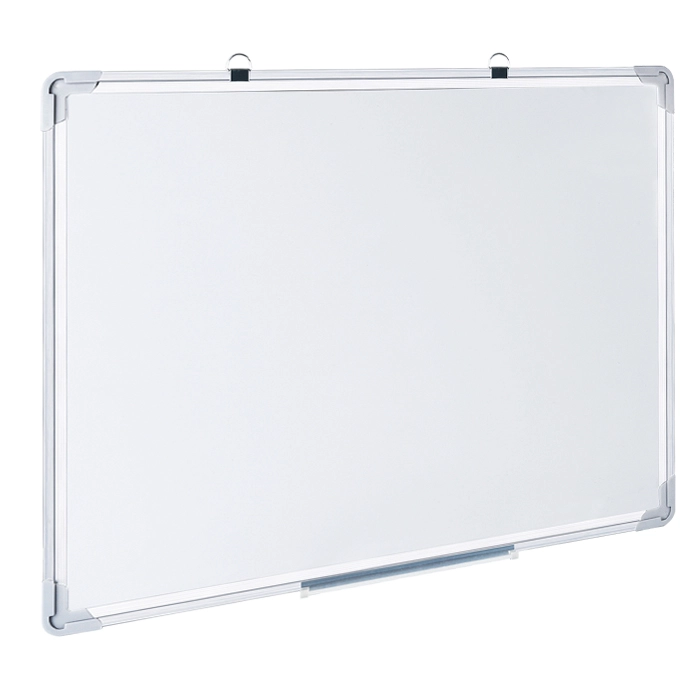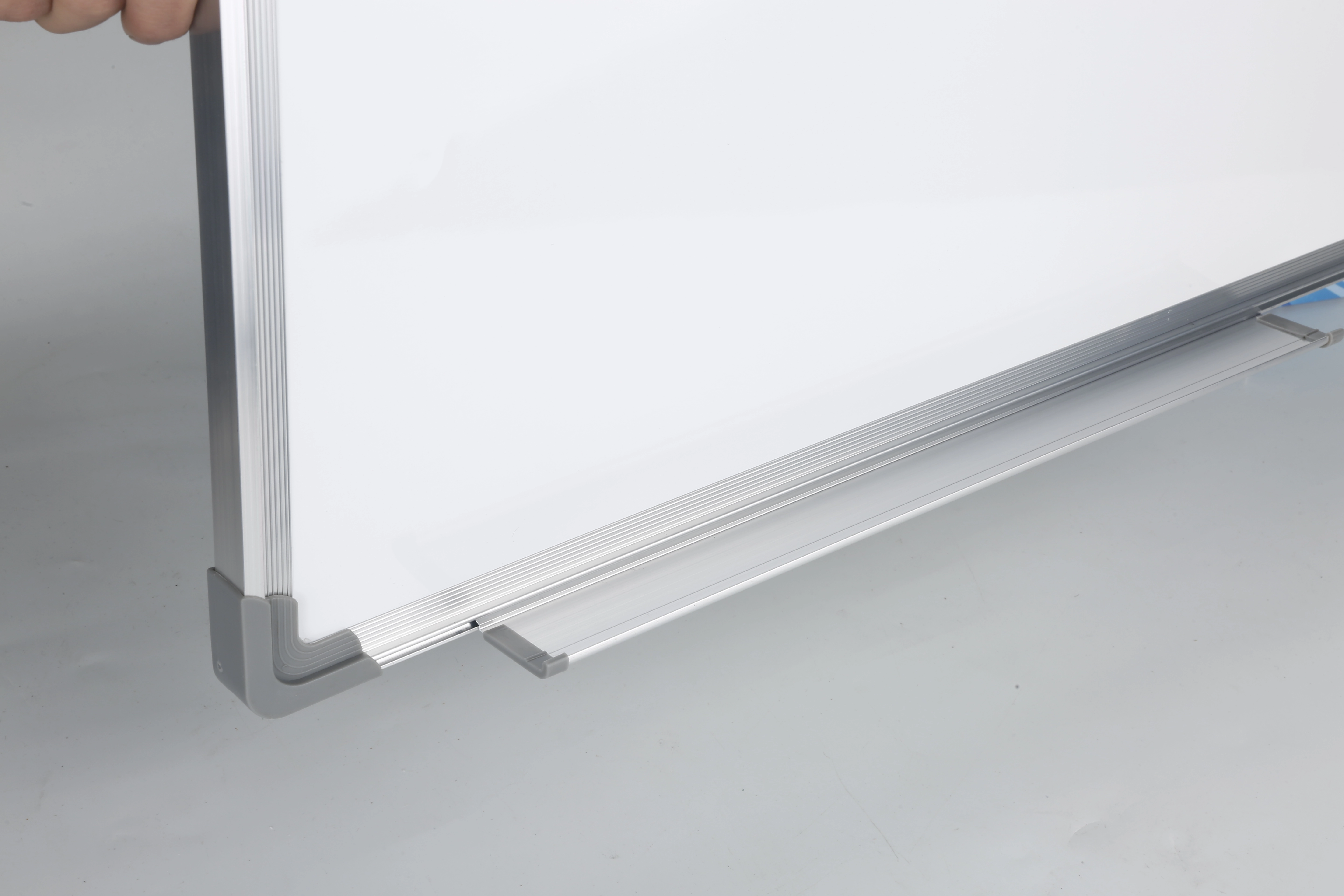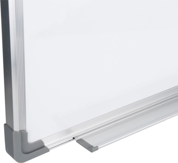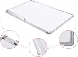 Stabilna aluminiowa rama z ochroną narożników zwiększa odporność i bezpieczeństwo przy codziennym użytkowaniu. W zestawie znajduje się praktyczna półka odkładcza na markery i akcesoria oraz uchwyty do zawieszenia umożliwiające szybki montaż na ścianie w poziomie lub w pionie.