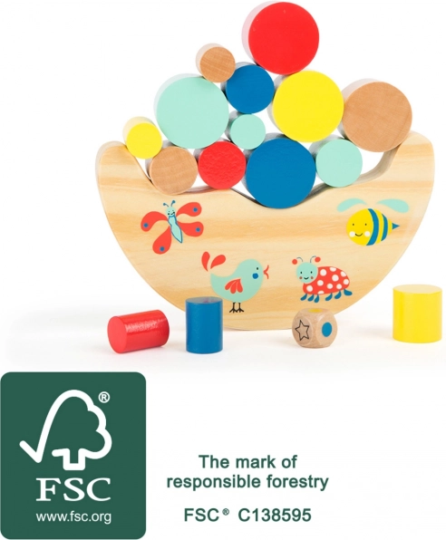 Leśna gra balansująca marki Mała noga jest wyzwaniem dla dzieci, które chcą wzmocnić swoją koordynację i precyzję. Z elementami do gry z certyfikowanego drewna możesz budować na chybotliwej huśtawce i starać się utworzyć jak najwyższą wieżę.