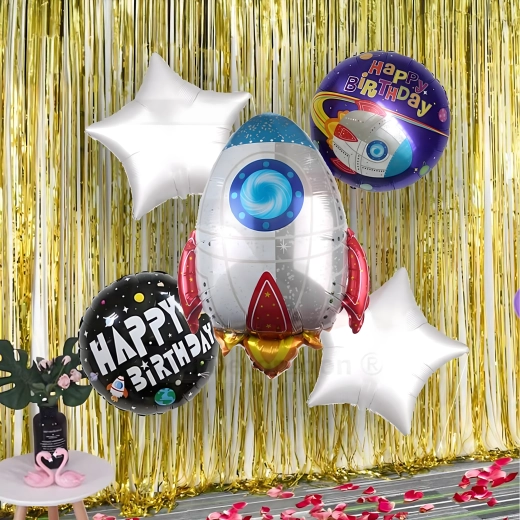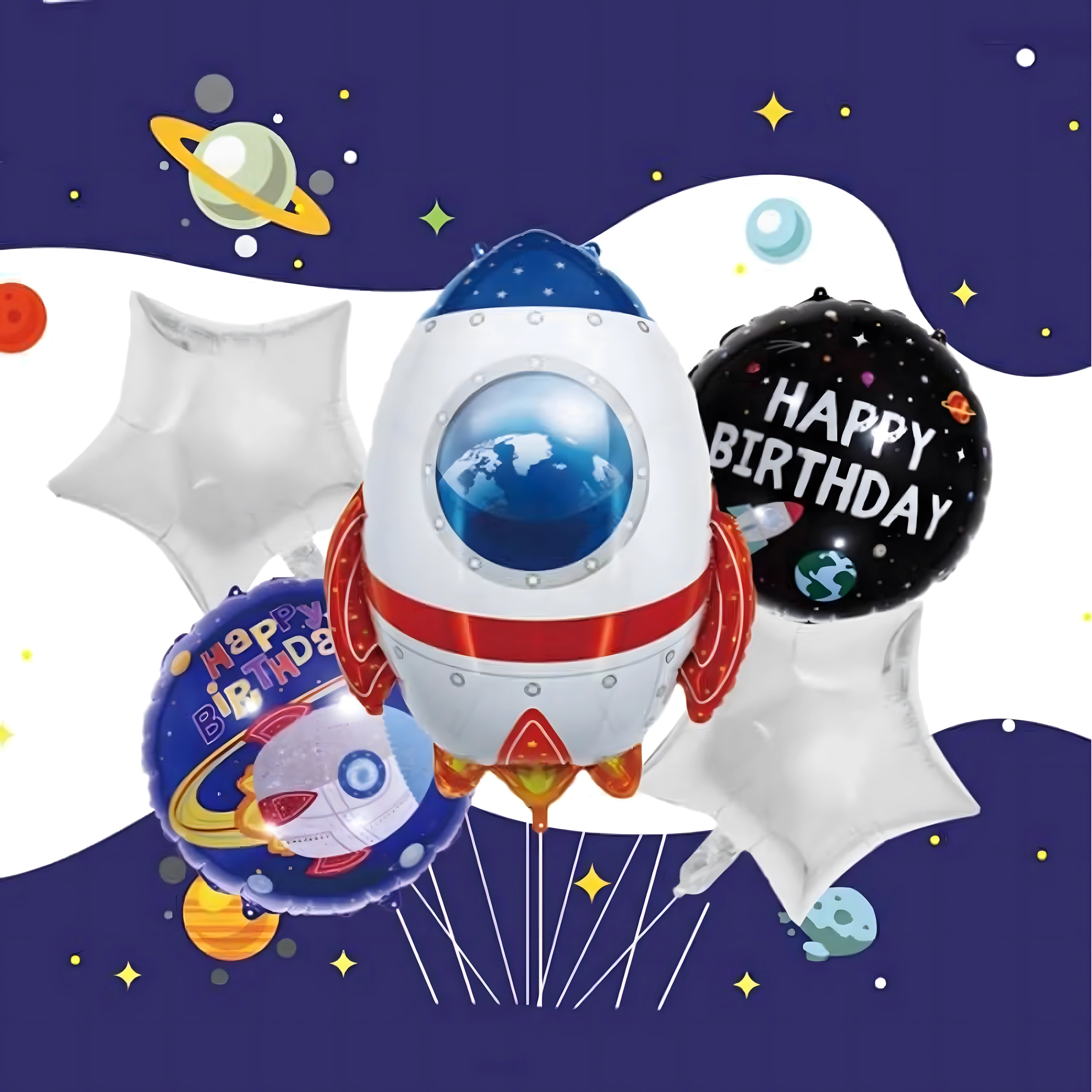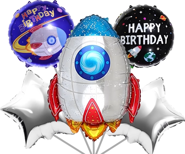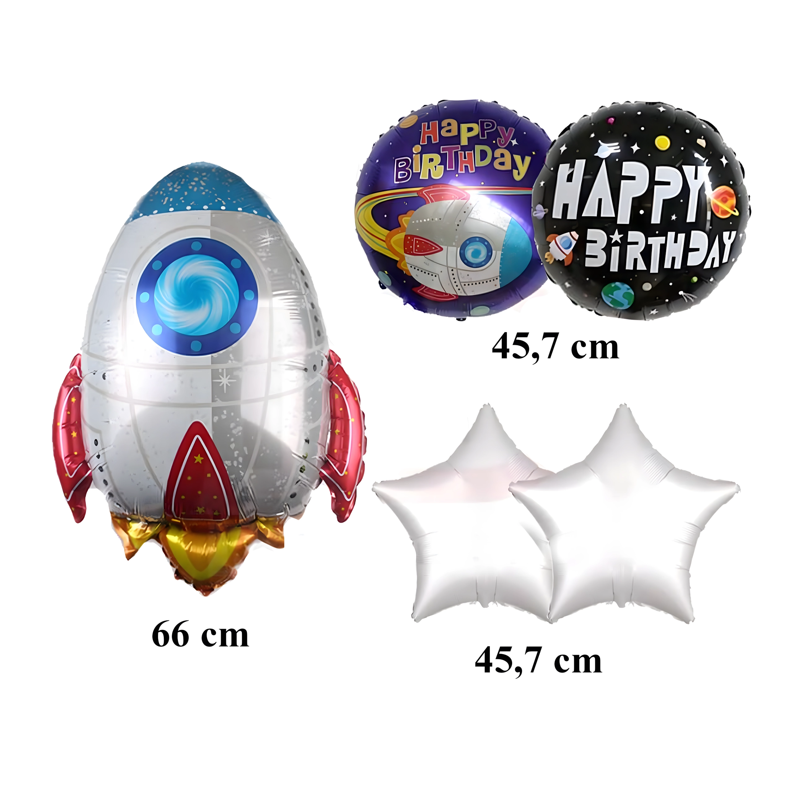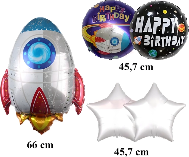 - 5 szt. balonów foliowych (astronauta, rakieta, gwiazdki)