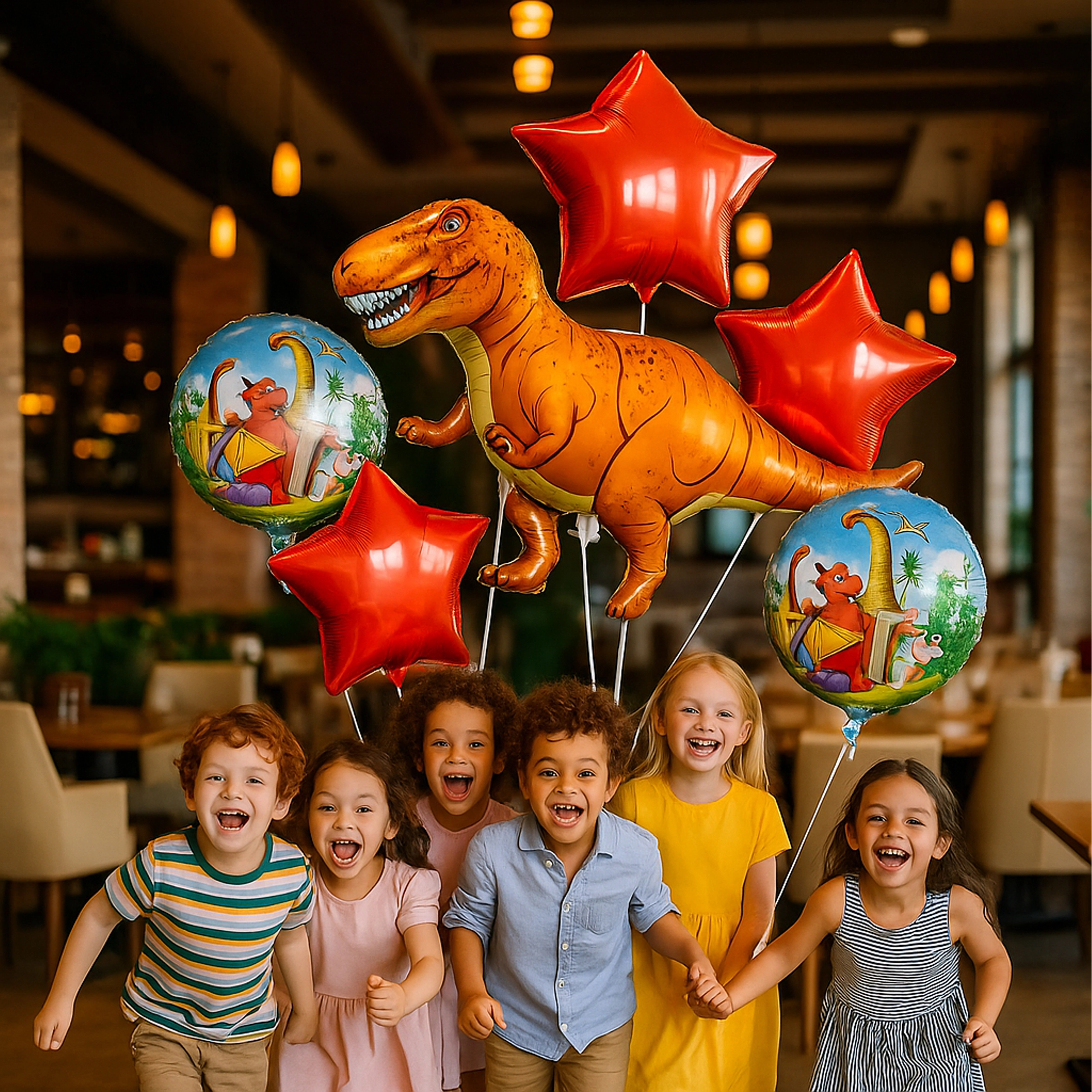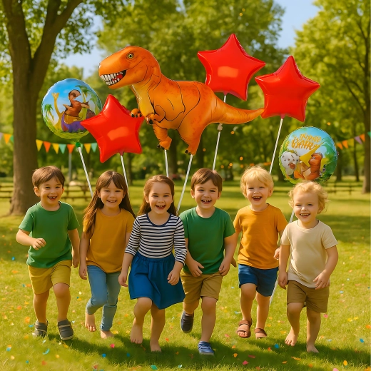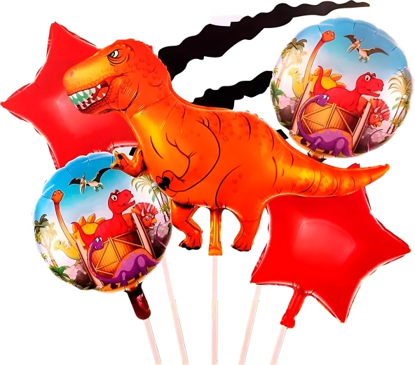 Wesoły zestaw balonów z motywem dinozaura rozświetli każdą imprezę. Zawiera 1 duży balon dinozaur, 2 balony z nadrukiem oraz 2 czerwone gwiazdy – doskonały wybór na dziecięce urodziny i prehistoryczne party.