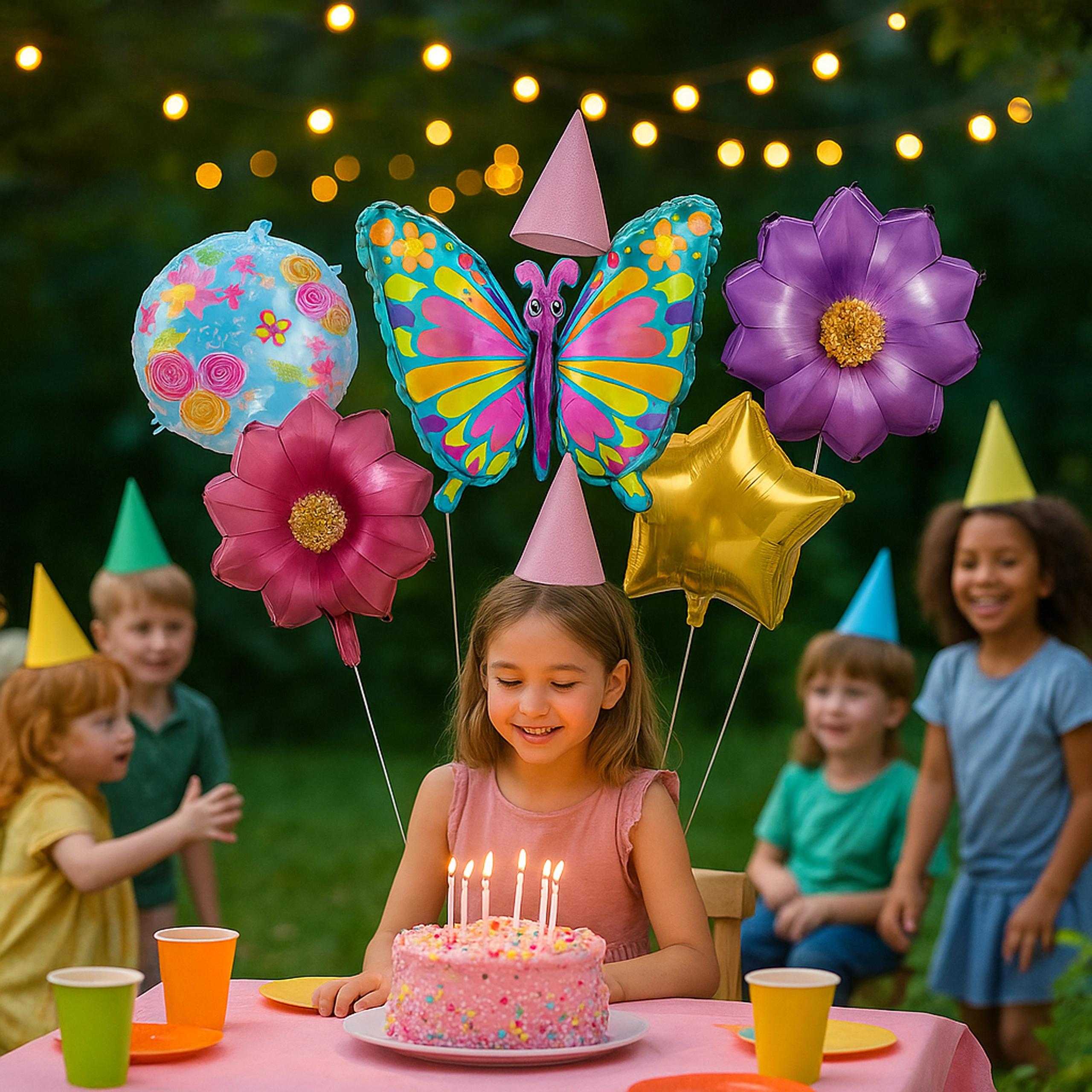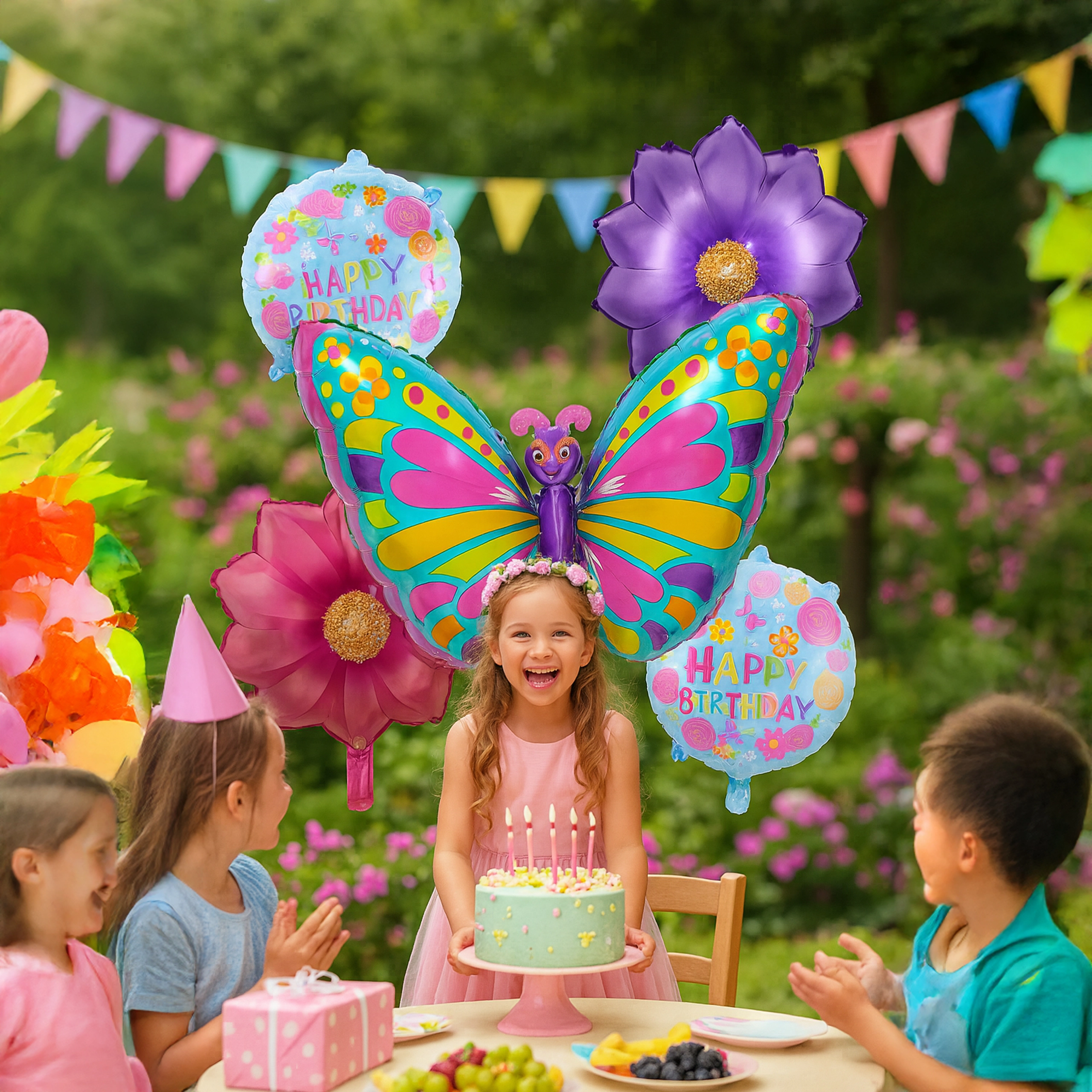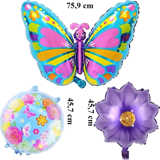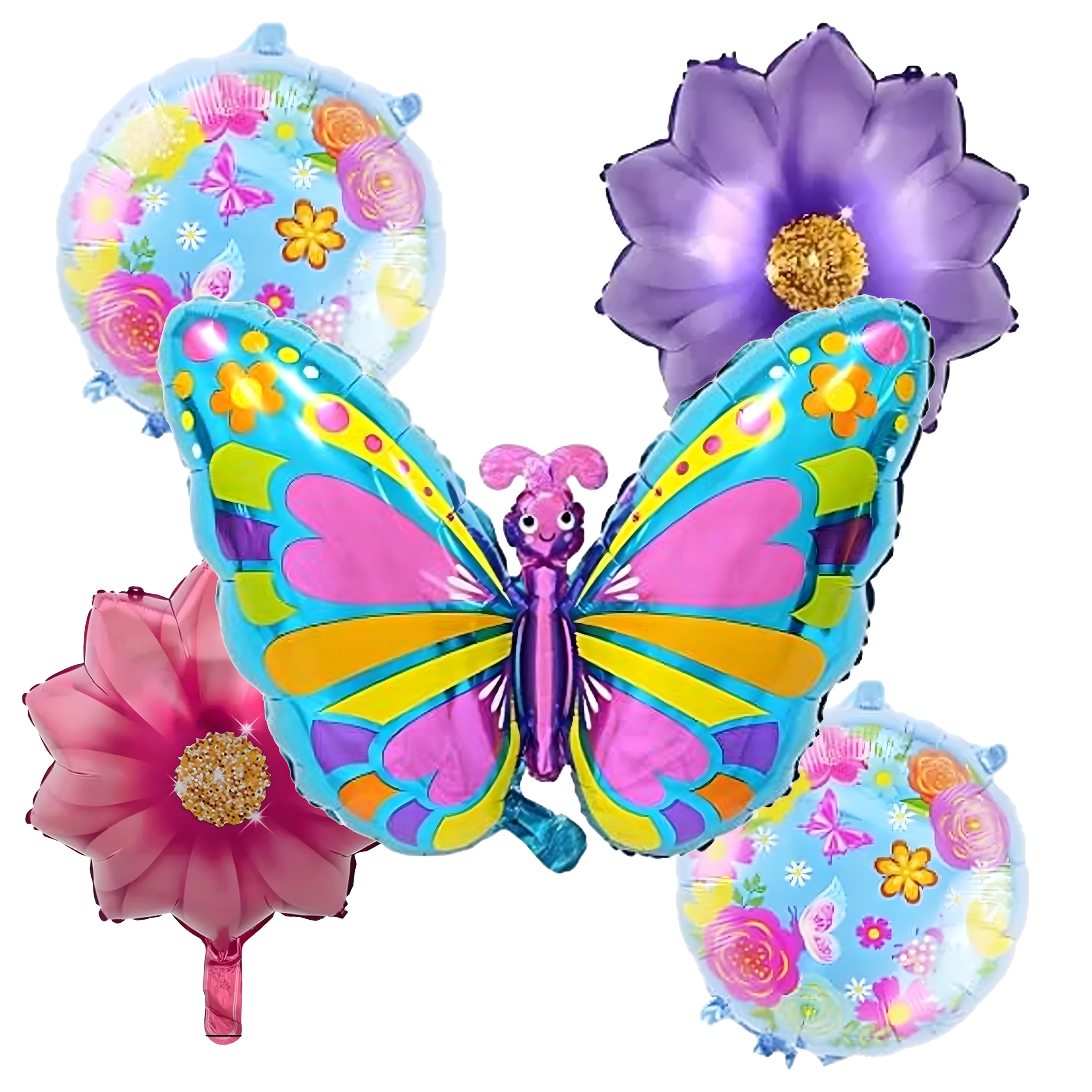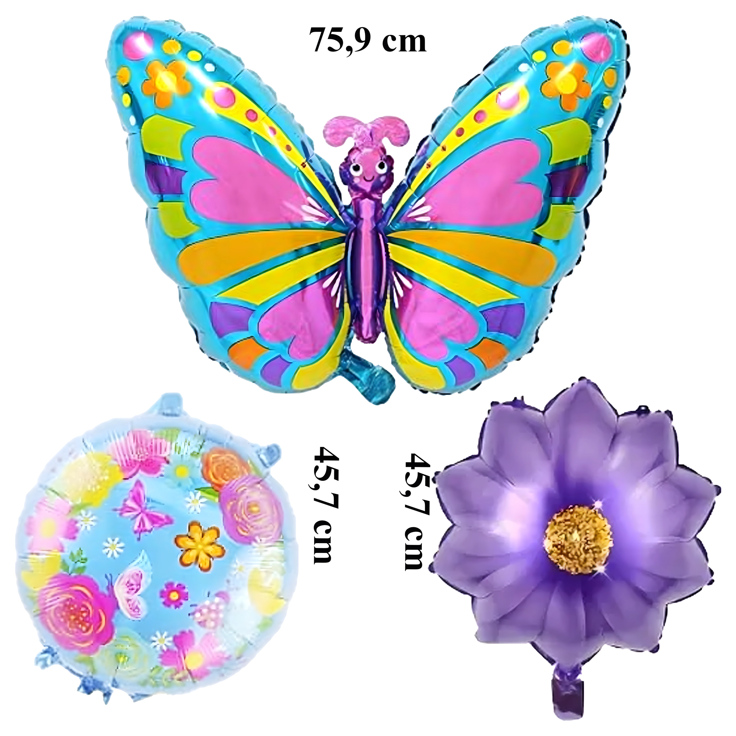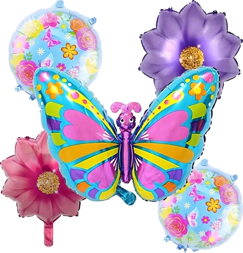 Ten zestaw balonów natychmiast wyczaruje bajkową atmosferę. Dominantą jest duży balon-motyl (ok. 75,9 cm), który uzupełniają 2 balony–kwiatuszki oraz 2 okrągłe balony z nadrukiem (ok. 45,7 cm). Idealny na urodziny, imprezy tematyczne i kąciki fotograficzne.
