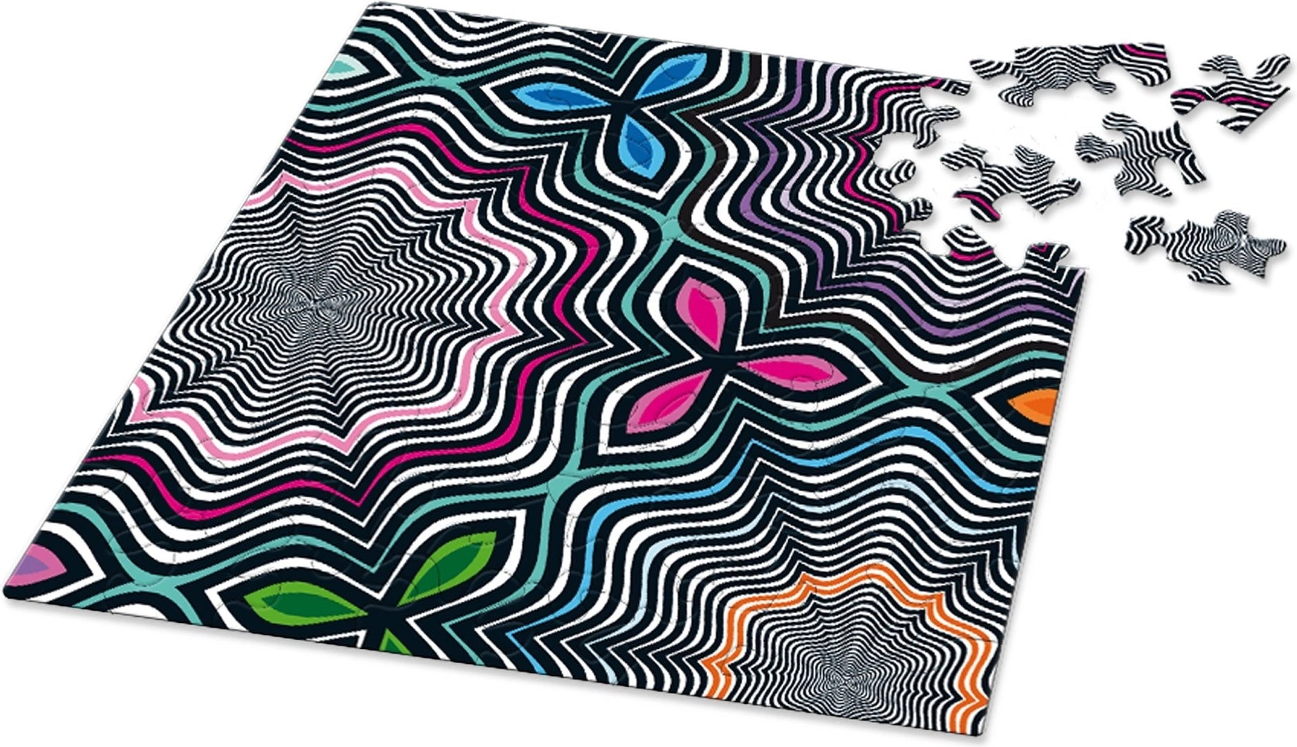 Curiosi Q Shake wzór VI zapewnia wyjątkowe wrażenia z układania. Nieszablonowo wycięte elementy utrzymują uwagę i frajdę, a elegancki kwadratowy format świetnie prezentuje się na półce lub w ramce.