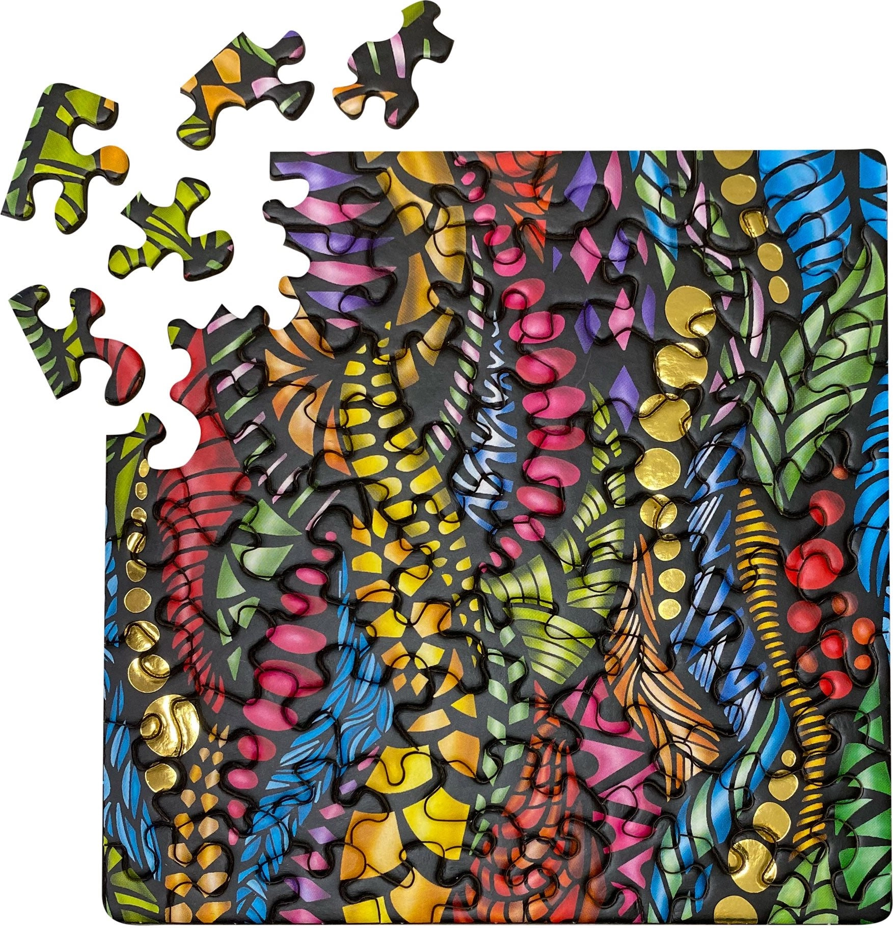 Kwadratowe puzzle Curiosi Q Gold we wzorze I oferują wyjątkowe doznania wizualne dzięki błyszczącemu złotemu efektowi, który po ułożeniu pięknie się prezentuje. Dzięki 72 elementom i nietypowym kształtom układanie jest zabawne, a jednocześnie przyjemnie wymagające.
