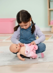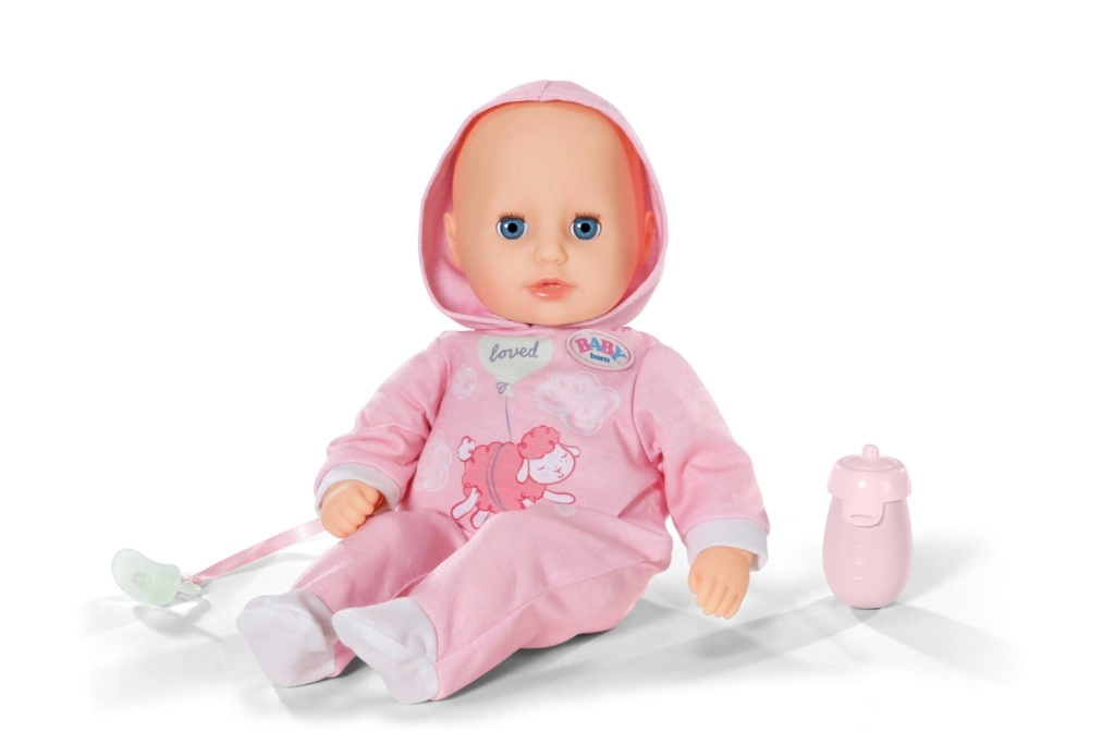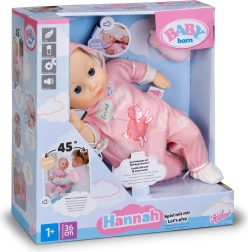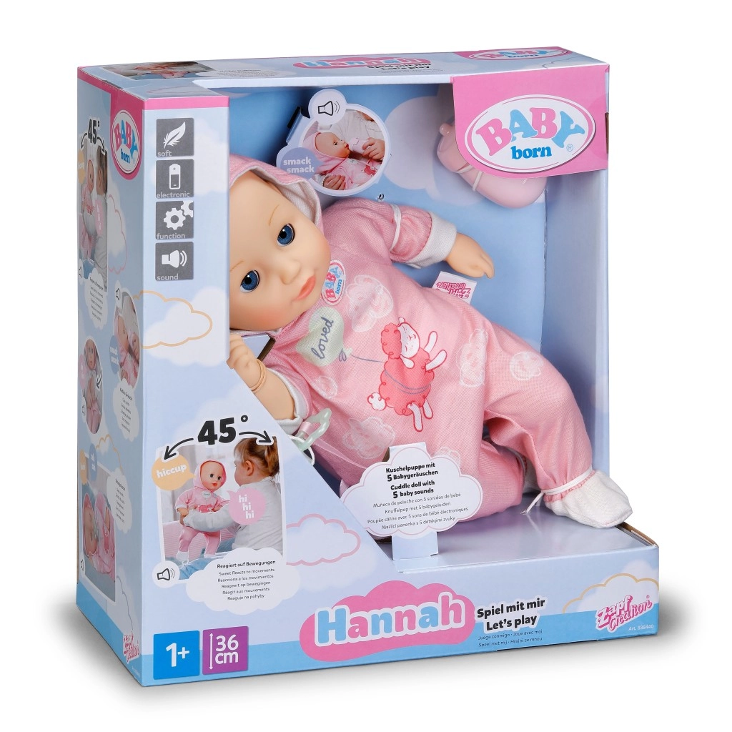Urocza lalka BABY born Hannah o wysokości 36 cm to idealna przyjaciółka do codziennej zabawy i przytulania. Oferuje miękkie materiałowe ciałko, realistyczne dziecięce dźwięki, potrafi pić z butelki z odgłosami picia, zamyka oczy i podczas usypiania wydaje delikatne, kojące dźwięki. W zestawie znajduje się smoczek i butelka.