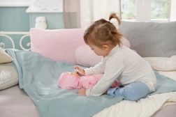 Lalka ma miękkie materiałowe ciałko idealne do przytulania oraz realistyczną główkę z delikatnymi rysami, które wspierają empatyczną zabawę.