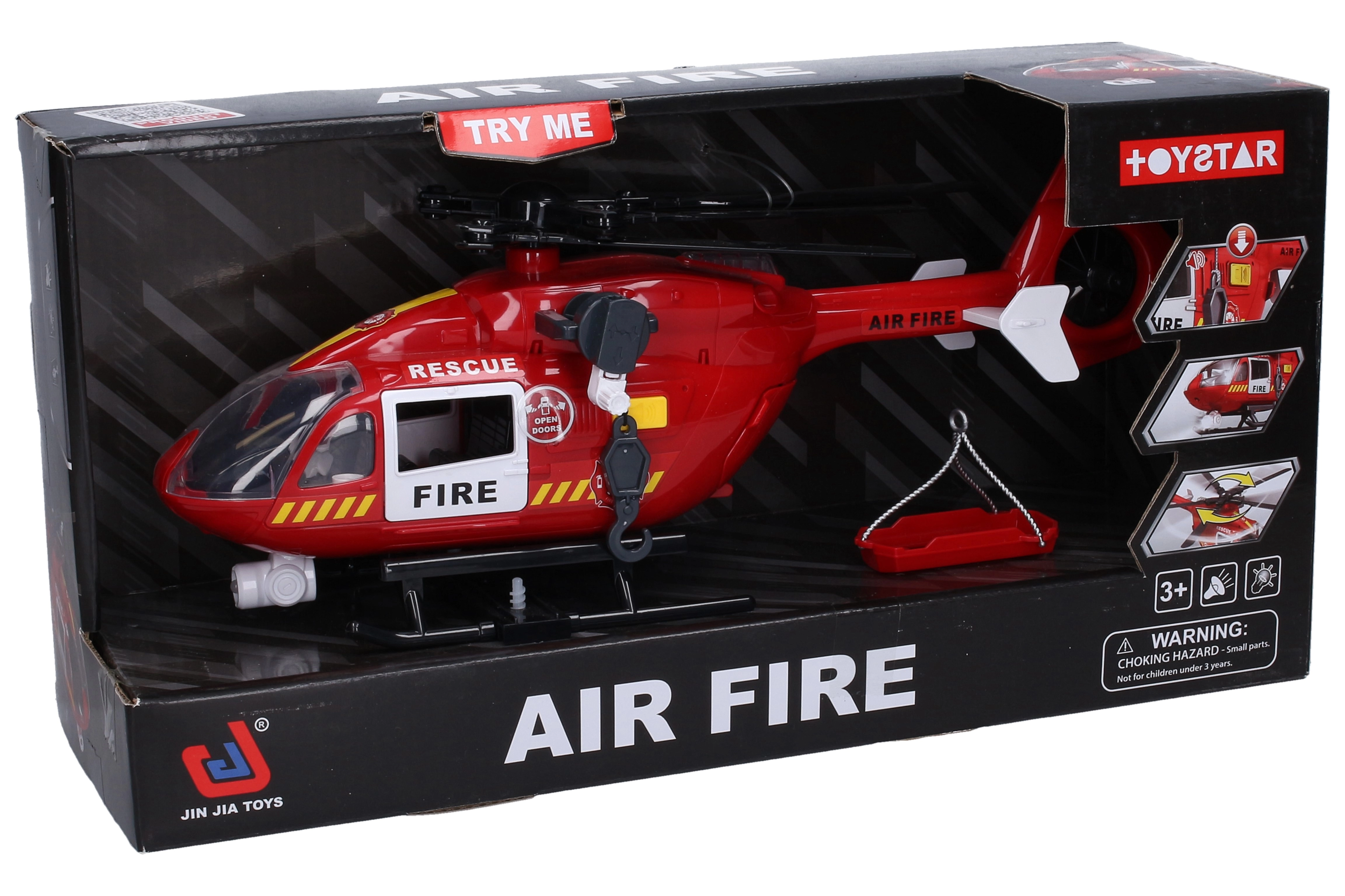 Realistyczny helikopter strażacki o długości 38 cm zapewni godziny pełnej akcji zabawy. Oferuje efekty świetlne i dźwiękowe, otwierane przednie i tylne drzwi, wysuwaną linę z hakiem oraz nosze ratunkowe. Baterie 2× AAA w zestawie, a wszystko obsłużysz wygodnym przyciskiem z boku helikoptera.