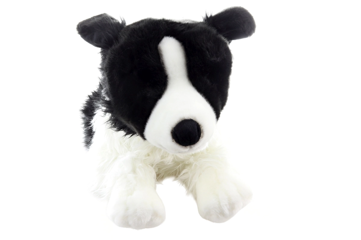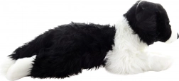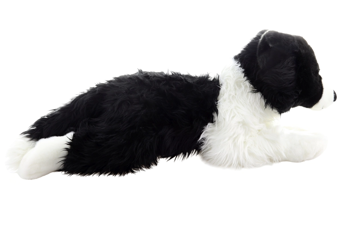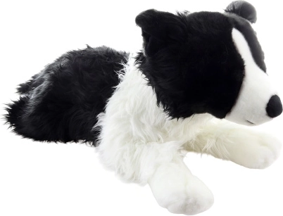Ten duży pluszowy piesek border collie w leżącej pozycji zachwyca od pierwszego dotyku. Wykonany z bardzo delikatnego, przyjemnego w dotyku materiału, który zachęca do tulenia i przytulania. Realistyczne połączenie czarnej i białej sierści oraz urocze uszy nadają zabawce autentyczny wygląd.
