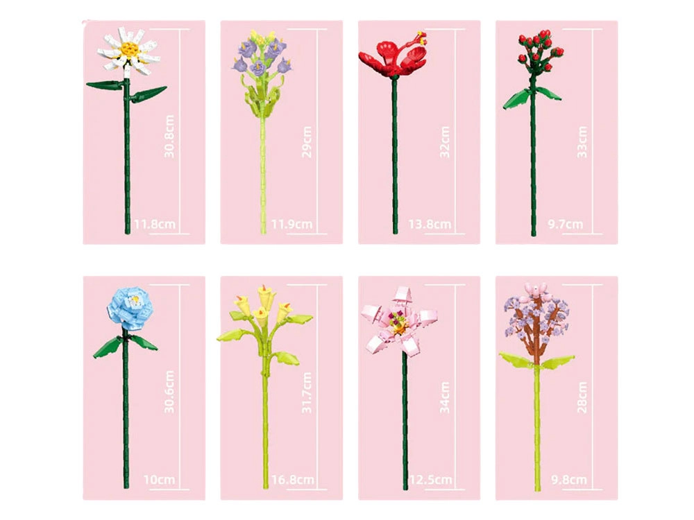 - Stokrotka: ok. 30,8 × 11,8 cm; Niebieska kalla: ok. 29 × 11,9 cm; Hibiskus: ok. 32 × 13,8 cm; Dziurawiec: ok. 33 × 9,7 cm; Niebieska róża: ok. 30,6 × 10 cm; Żółta kalla: ok. 31,7 × 16,8 cm; Czosnek ozdobny: ok. 34 × 12,5 cm; Bez (lilak): ok. 28 × 9,8 cm