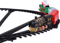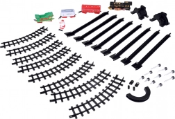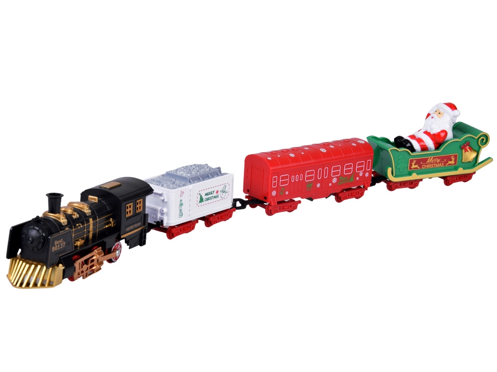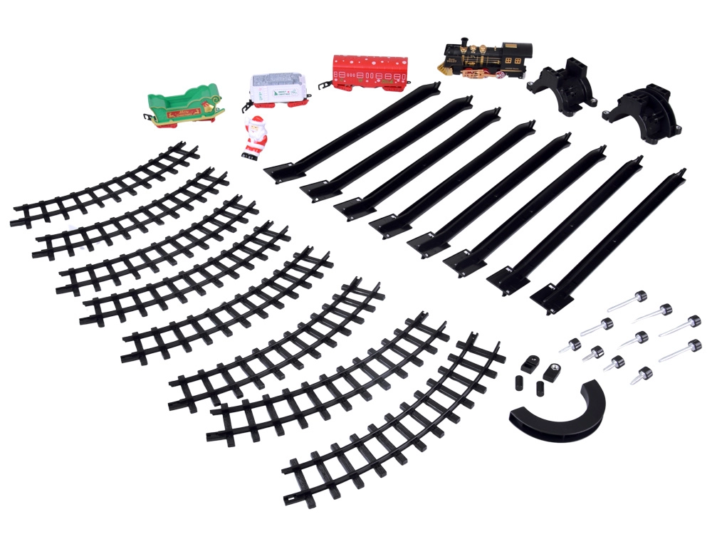 - Lokomotywa + 3 wagony (biała węglarka, czerwony wagon, zielone sanie z Mikołajem)