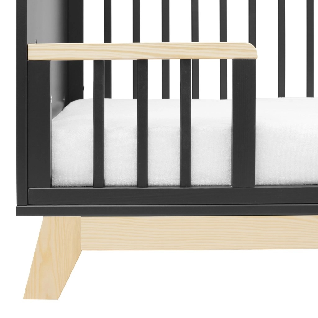 Łóżeczko łatwo dopasujesz do bieżących potrzeb: ma trzy poziomy wysokości stelaża oraz trzy wyjmowane szczebelki dla łatwiejszego dostępu. Gdy dziecko podrośnie, można zdjąć jeden bok i zastąpić go dołączoną barierką bezpieczeństwa, która wspiera samodzielność i jednocześnie chroni przed upadkiem.