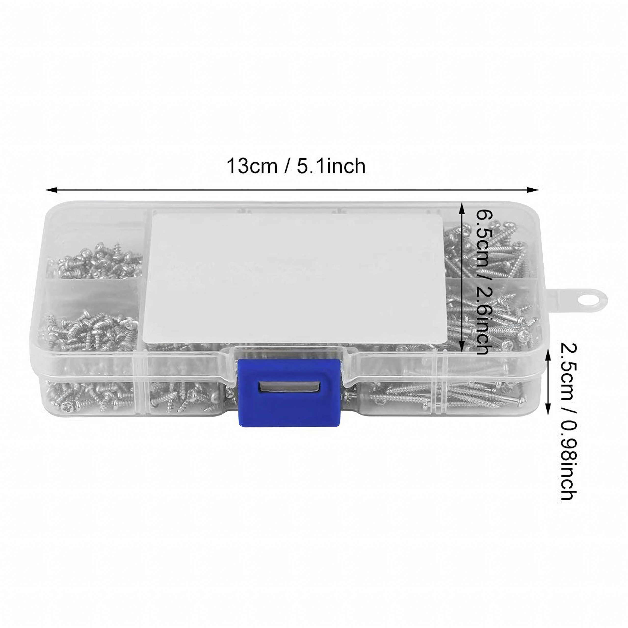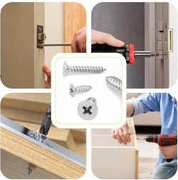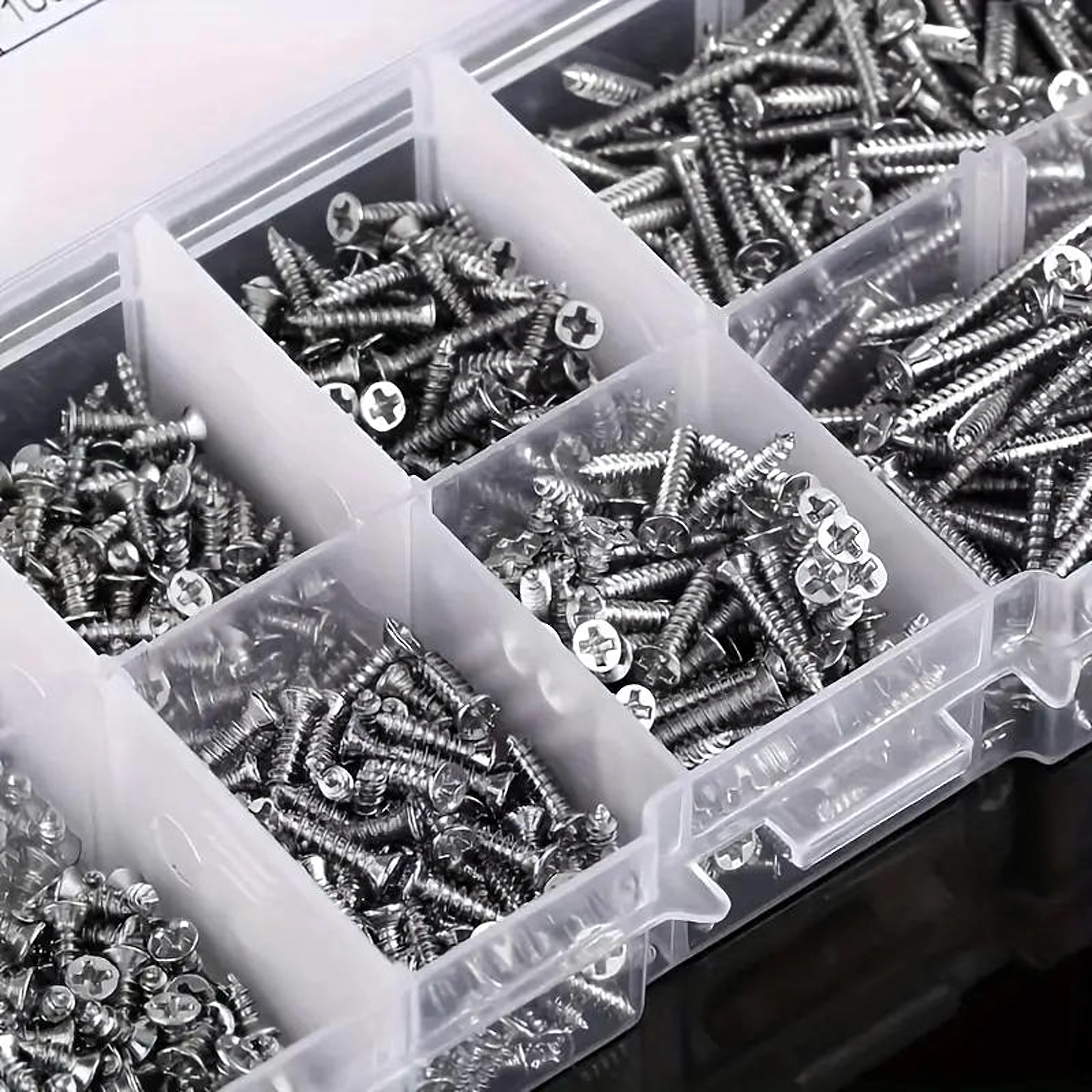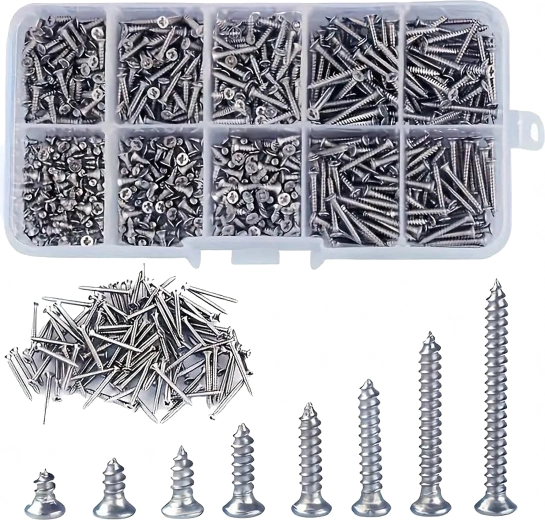 Przezroczysty organizer z przegródkami i opisem rozmiarów znacząco przyspiesza pracę i wybór. Śruby nadają się do precyzyjnych napraw elektroniki, montażu drobnych elementów, mocowania zawiasów i lekkich połączeń konstrukcyjnych w drewno, plastik i blachę.
