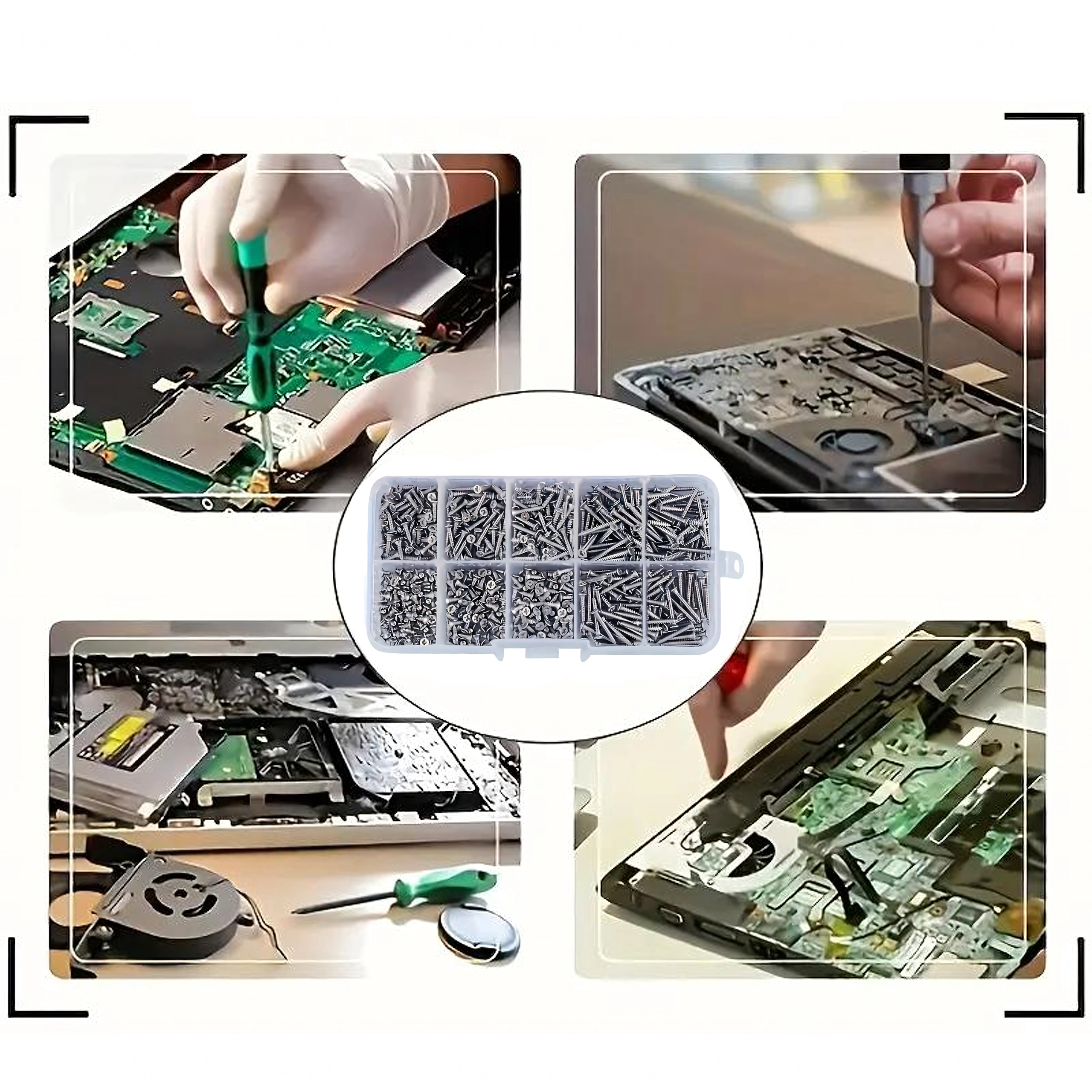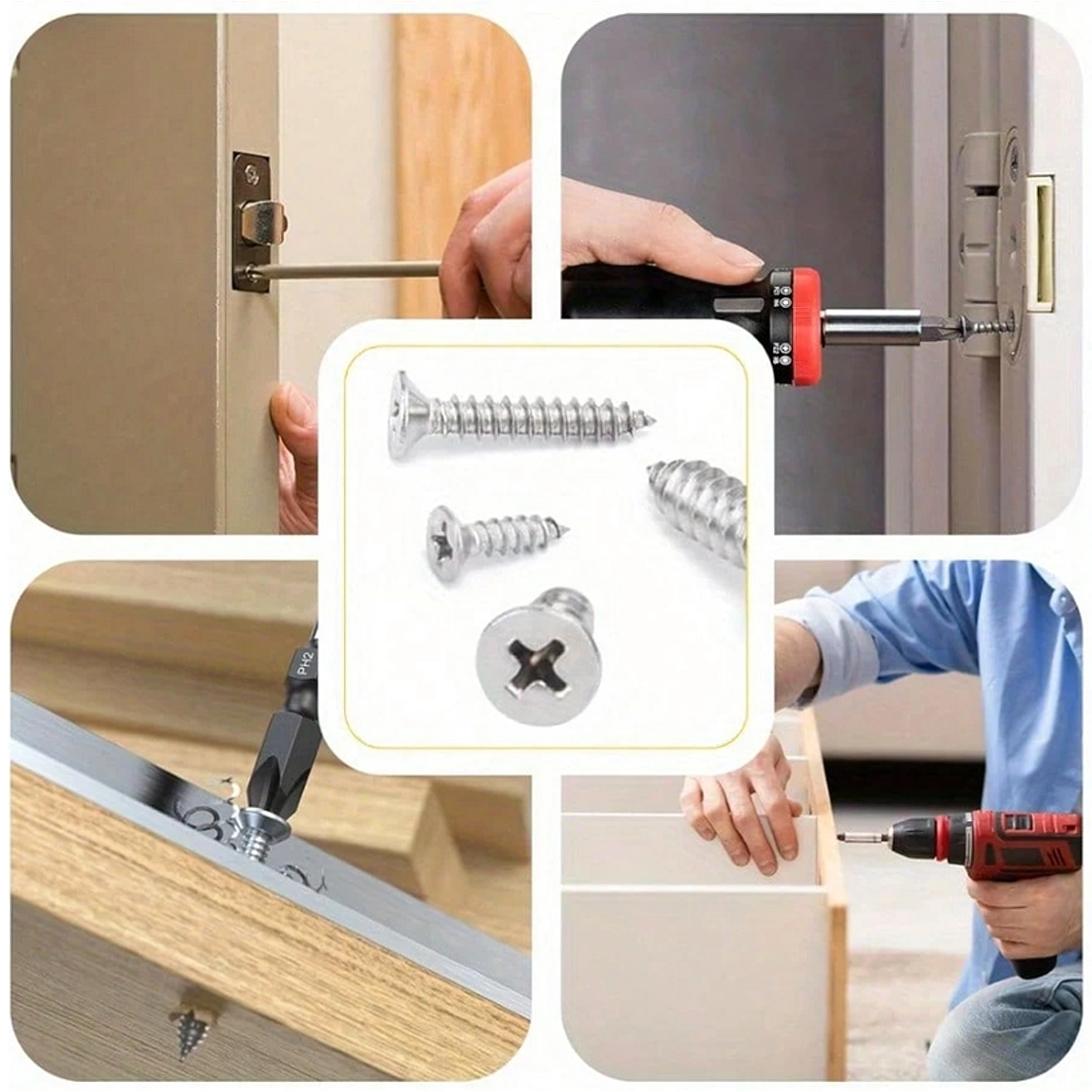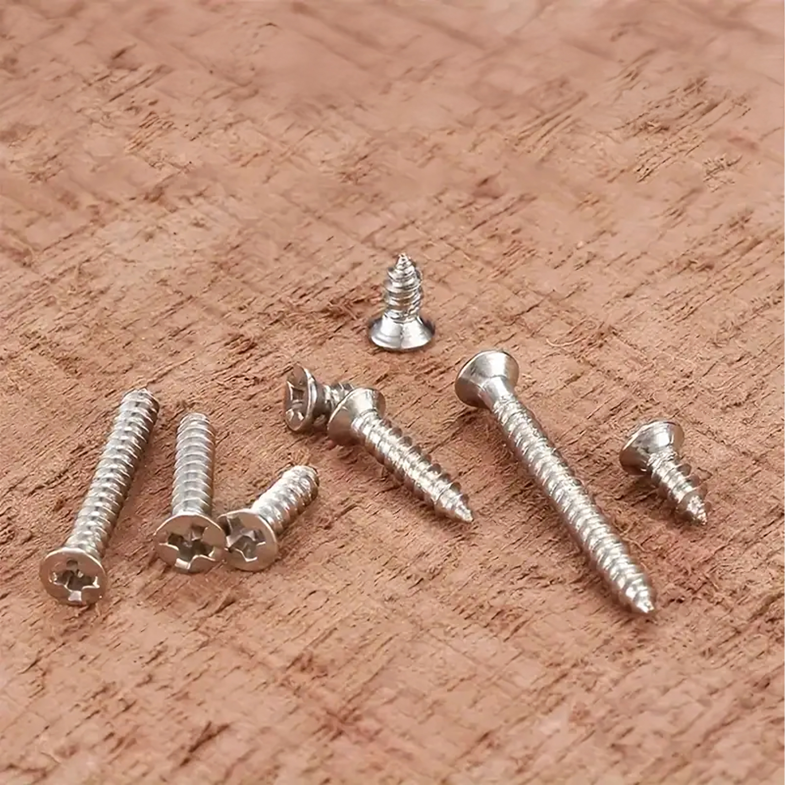 Przezroczysty organizer z przegródkami i opisem rozmiarów znacząco przyspiesza pracę i wybór. Śruby nadają się do precyzyjnych napraw elektroniki, montażu drobnych elementów, mocowania zawiasów i lekkich połączeń konstrukcyjnych w drewno, plastik i blachę.
