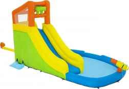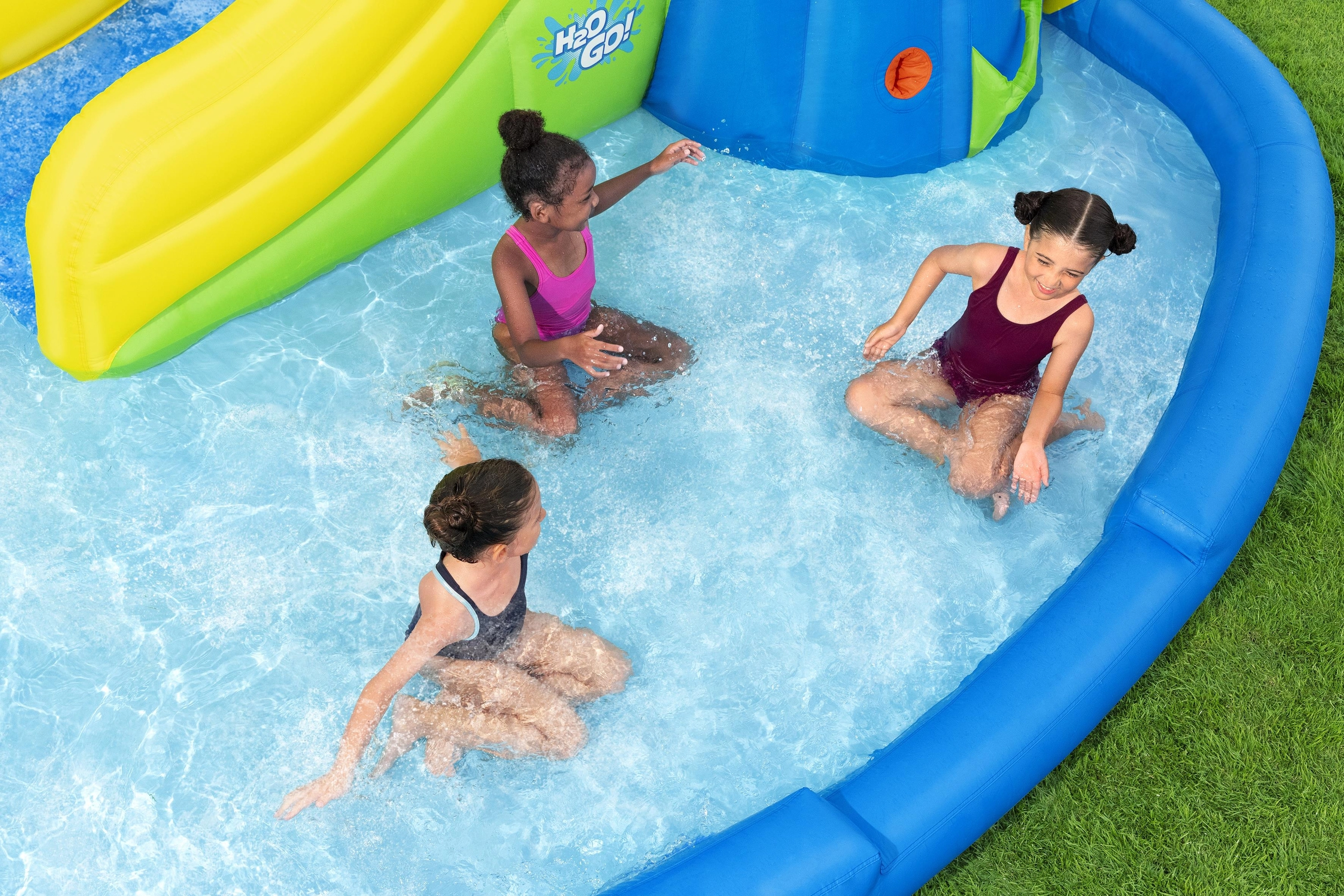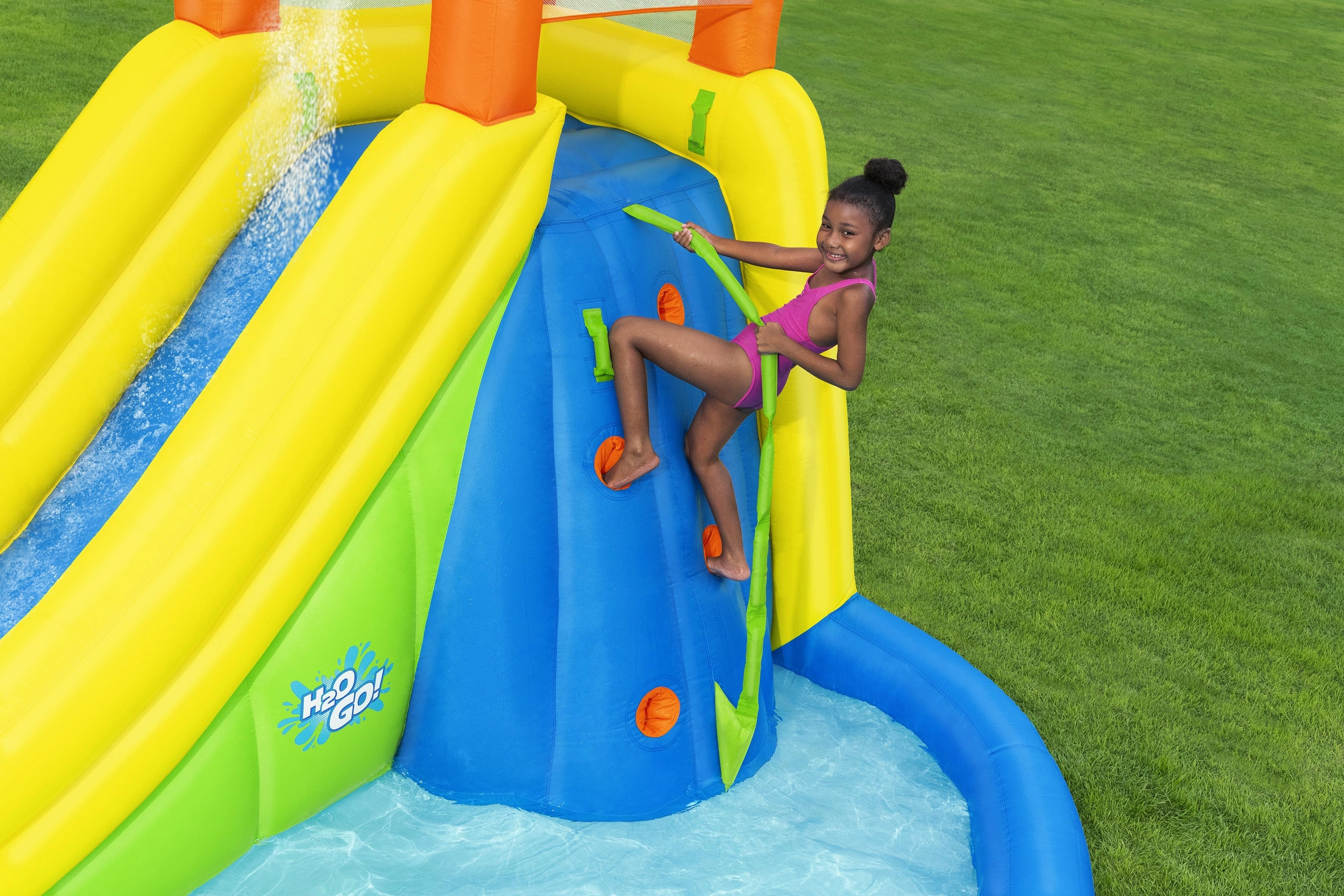 Nadmuchiwany wodny plac zabaw H2O GO! dostarcza dzieciom aktywnej rozrywki w ogrodzie – wspinaczka, zjazdy, pluskanie i wodne potyczki. Wbudowane spryskiwacze utrzymują zjeżdżalnie przyjemnie śliskie i chłodne, dzięki czemu dzieci cieszą się płynnym zjazdem nawet w upalne dni. Wytrzymały materiał i przemyślane elementy bezpieczeństwa czynią ten zestaw idealnym wyborem na rodzinne lato.