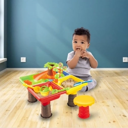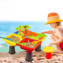 Podzielne wanienki i centralny element wodny umożliwiają jednoczesne tworzenie w piasku oraz eksperymenty z nurtem wody, przelewaniem i obracającymi się kółeczkami.