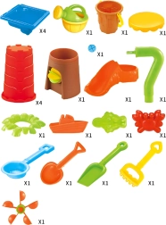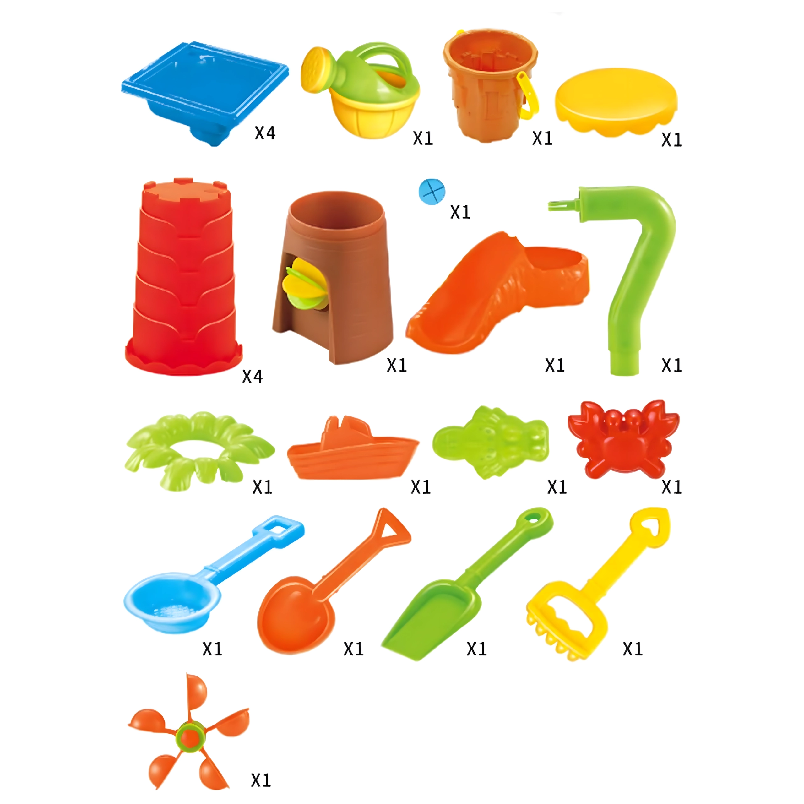 W zestawie znajdziesz konewkę, łopatki, grabki, sitko, foremki, kubeczki oraz małą zjeżdżalnię – dzieci mają wszystko pod ręką do nieskończonych wariantów zabawy.