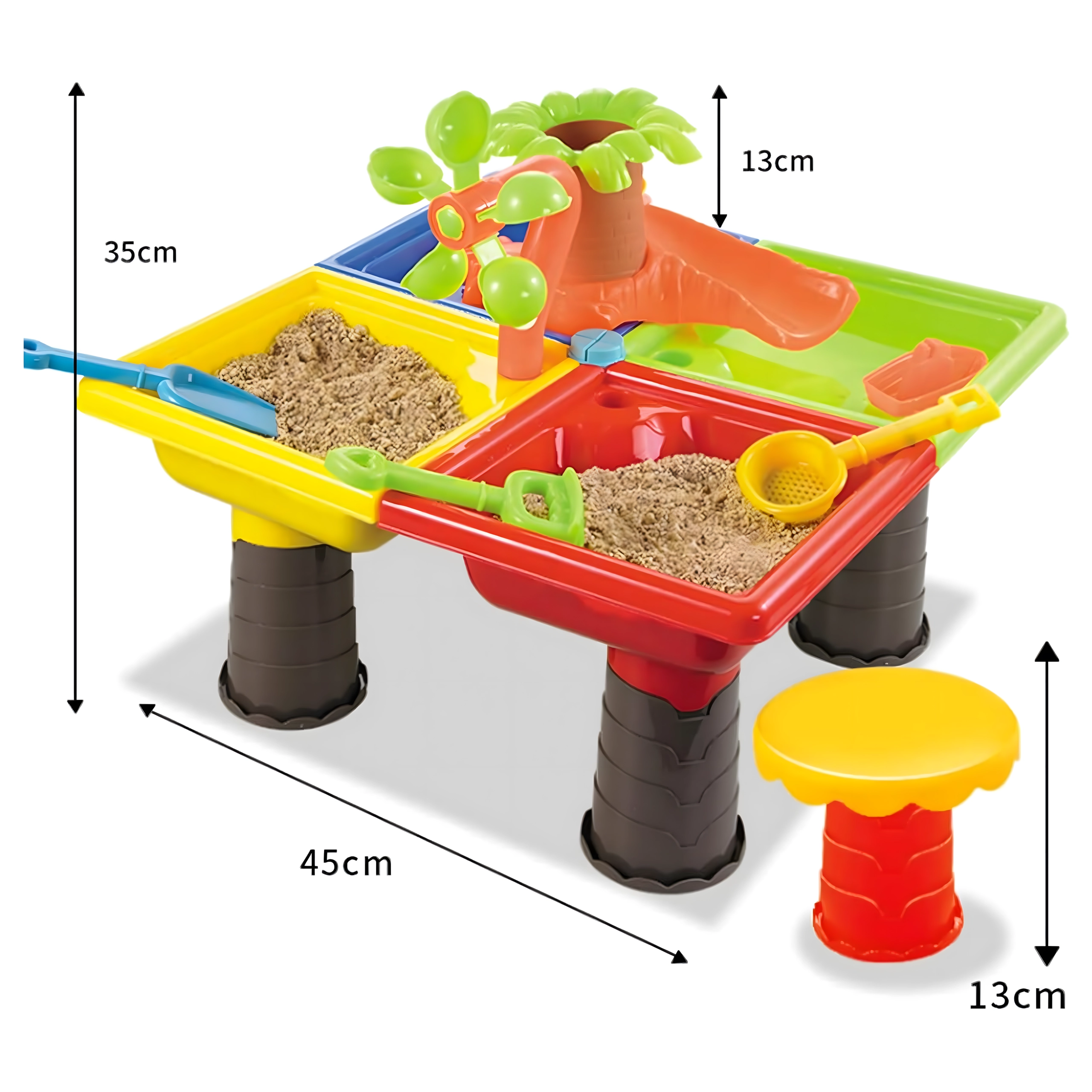 Ten multifunkcyjny stolik wodno‑piaskowy zapewnia dzieciom godziny sensorycznej zabawy. Cztery komory pozwalają łączyć aktywności wodne i piaskowe, a centralny element wodny z „palemką” i obracającymi się kółeczkami zamienia każde nalewanie w małe widowisko. Lekka i wytrzymała konstrukcja łatwo się czyści, a stabilne nogi gwarantują bezpieczną zabawę na zewnątrz i w domu.