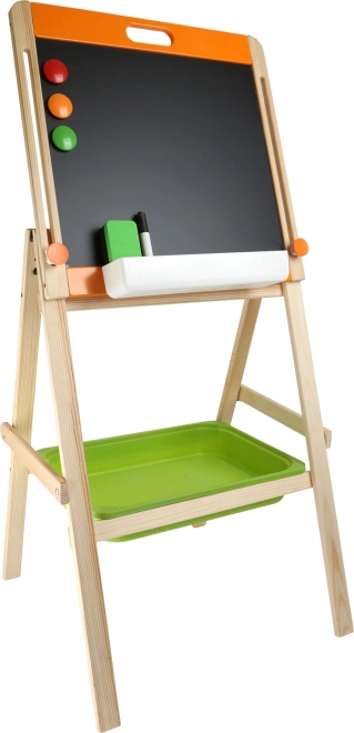 Stabilna drewniana konstrukcja z dystansami zapewnia bezpieczne pisanie bez chybotania, a praktyczne zielone pudełko na akcesoria utrzymuje kredy, marker i magnesy zawsze pod ręką. Tablica wspiera aktywną zabawę, rozwój motoryki, wyobraźni oraz podstaw alfabetu i liczenia.