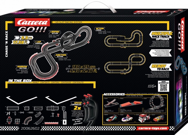 Autodroga CARRERA GO Tuning Zone dostarcza adrenalinowej jazdy na domowym torze. Na długości 5,3 metra czeka cię różnorodna kombinacja elementów: pętla, pionowa ściana, skrzyżowanie, zwężenie, szybkie proste i techniczne zakręty. Dwa szczegółowo wykonane hipersamochody w skali 1:43 są gotowe do pojedynku, a kontrolery z funkcją Turbo rozpędzają je do maksimum.