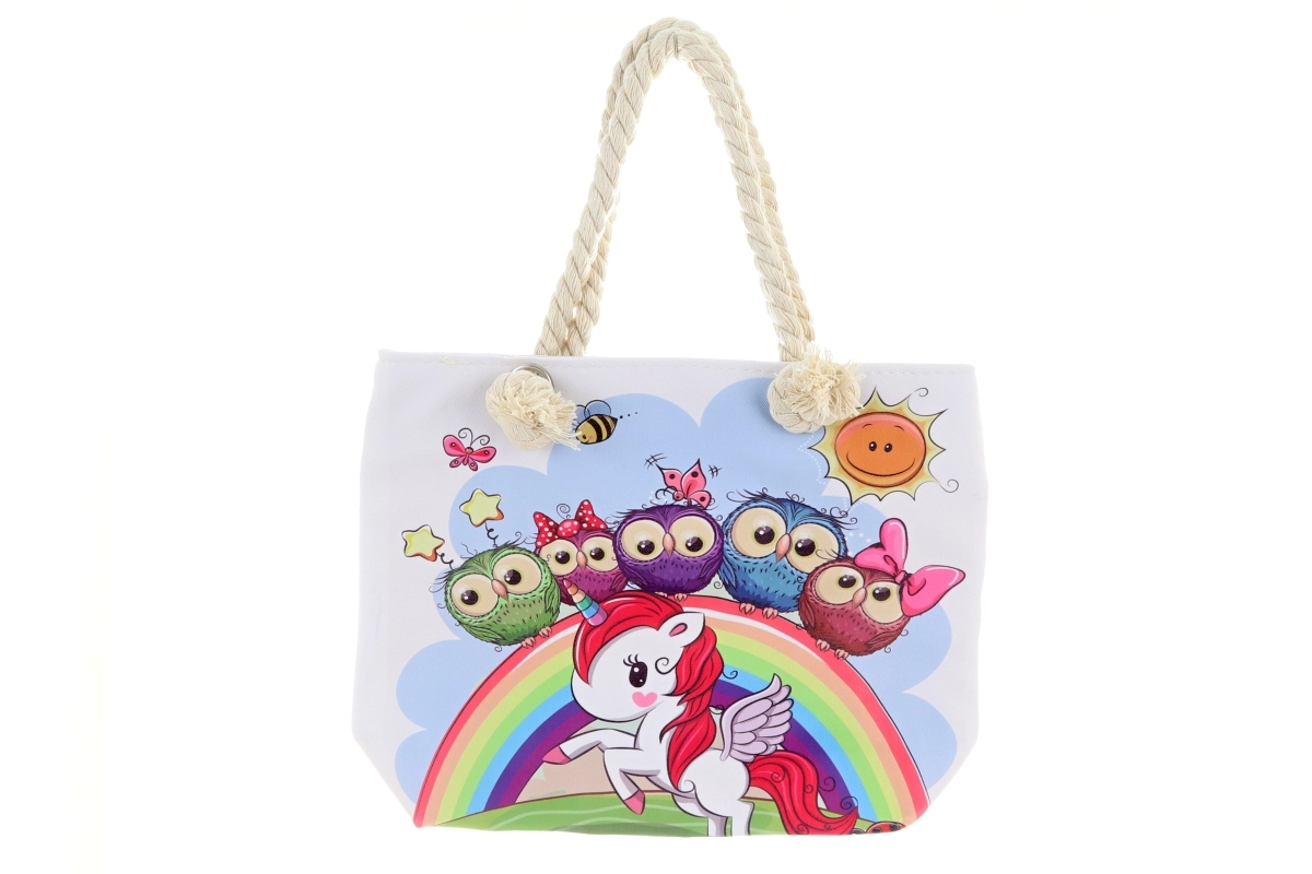 Ta urocza torebka na ramię z motywem jednorożca i sówek jest idealna do codziennego noszenia drobnych skarbów. Błyszcząca przednia część z ekoskóry nadaje nowoczesny wygląd, a tylna część z tkaniny zapewnia lekkość i komfort.